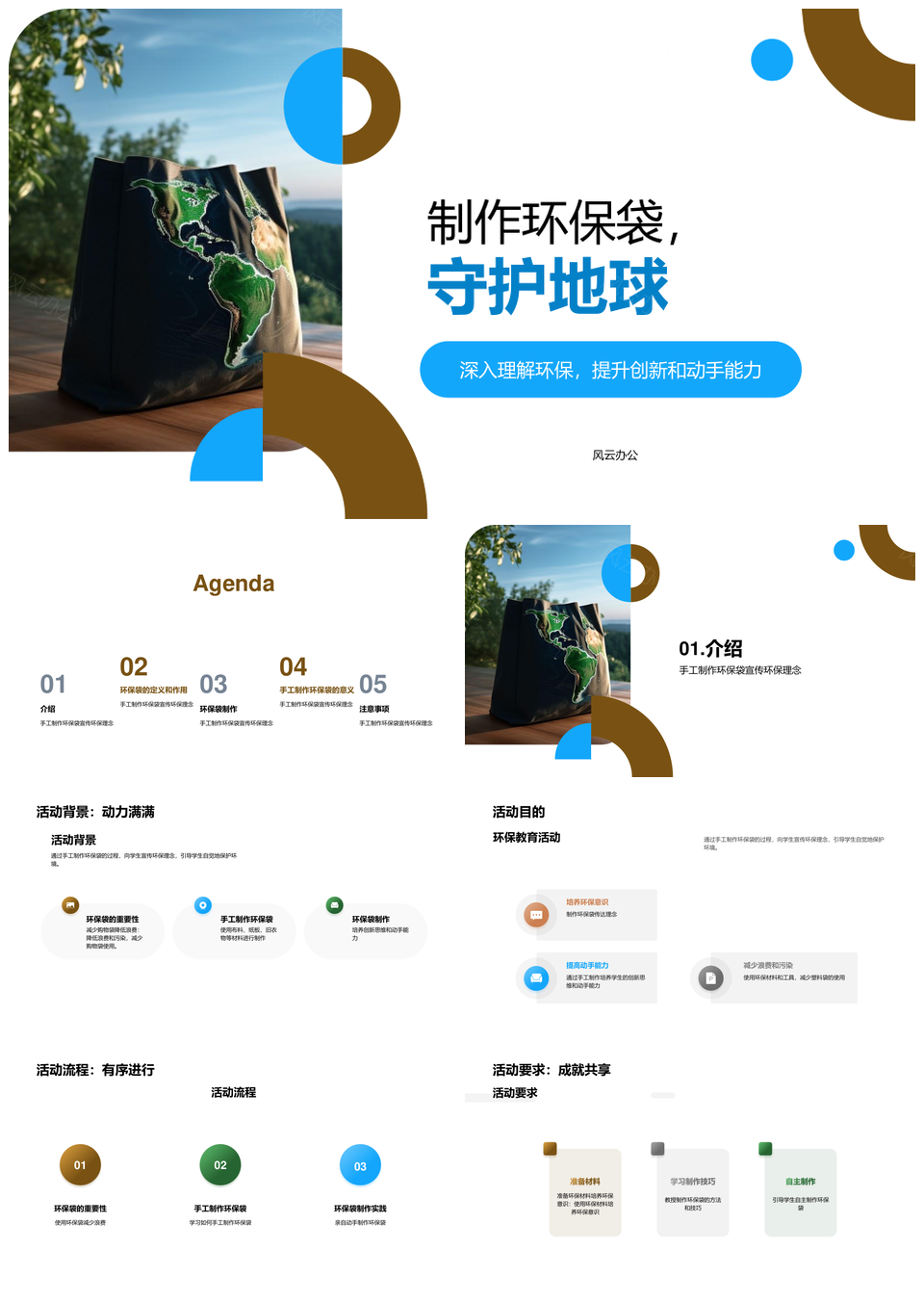 风云办公提供的五年级师生手制环保袋守护地球PPT模板,下载格式为pptx,一共24页,作品中文字及图均可以修改和编辑,图片更改请在作品中右键图片并更换,文字修改请直接点击文字进行修改。