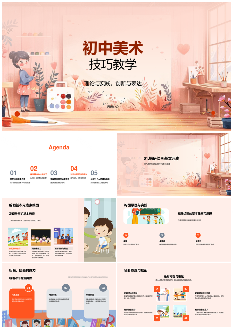 风云办公提供的初中美术基础技巧与创新实践教学PPT模板,下载格式为pptx,一共28页,作品中文字及图均可以修改和编辑,图片更改请在作品中右键图片并更换,文字修改请直接点击文字进行修改。