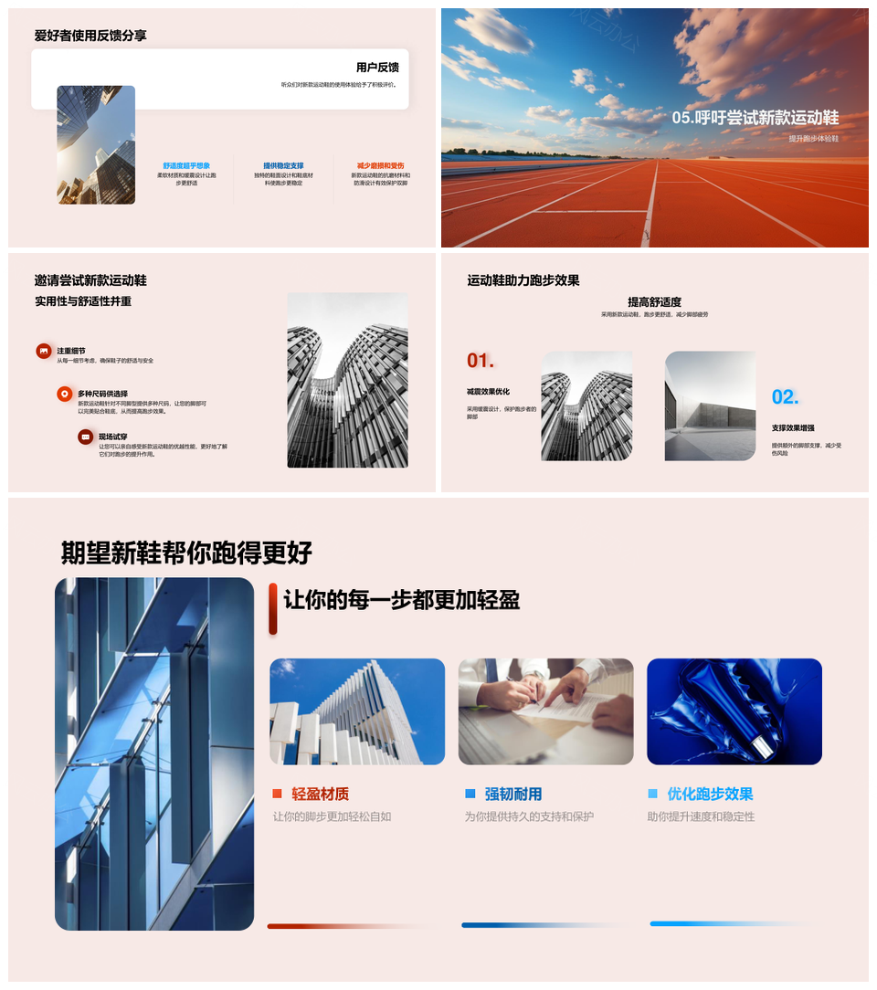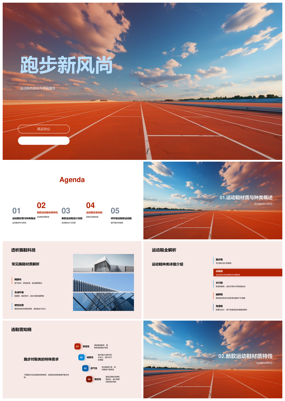 这是一张跑步新风尚XX材质运动鞋升级体验性能PPT模板,包含跑步、新风尚、XX材质、运动鞋、升级、体验、性能等主题内容,也可用作跑步新风尚XX材质运动鞋、新风尚XX材质运动鞋升级、XX材质运动鞋升级体验、运动鞋升级体验性能、跑步新风尚XX材质、新风尚XX材质运动鞋、XX材质运动鞋升级、运动鞋升级体验、升级体验性能、跑步新风尚、新风尚XX材质、XX材质运动鞋、运动鞋升级、升级体验、体验性能等PPT场景使用。 风云办公提供的跑步新风尚XX材质运动鞋升级体验性能PPT模板,下载格式为pptx,一共23页,作品中文字及图均可以修改和编辑,图片更改请在作品中右键图片并更换,文字修改请直接点击文字进行修改。