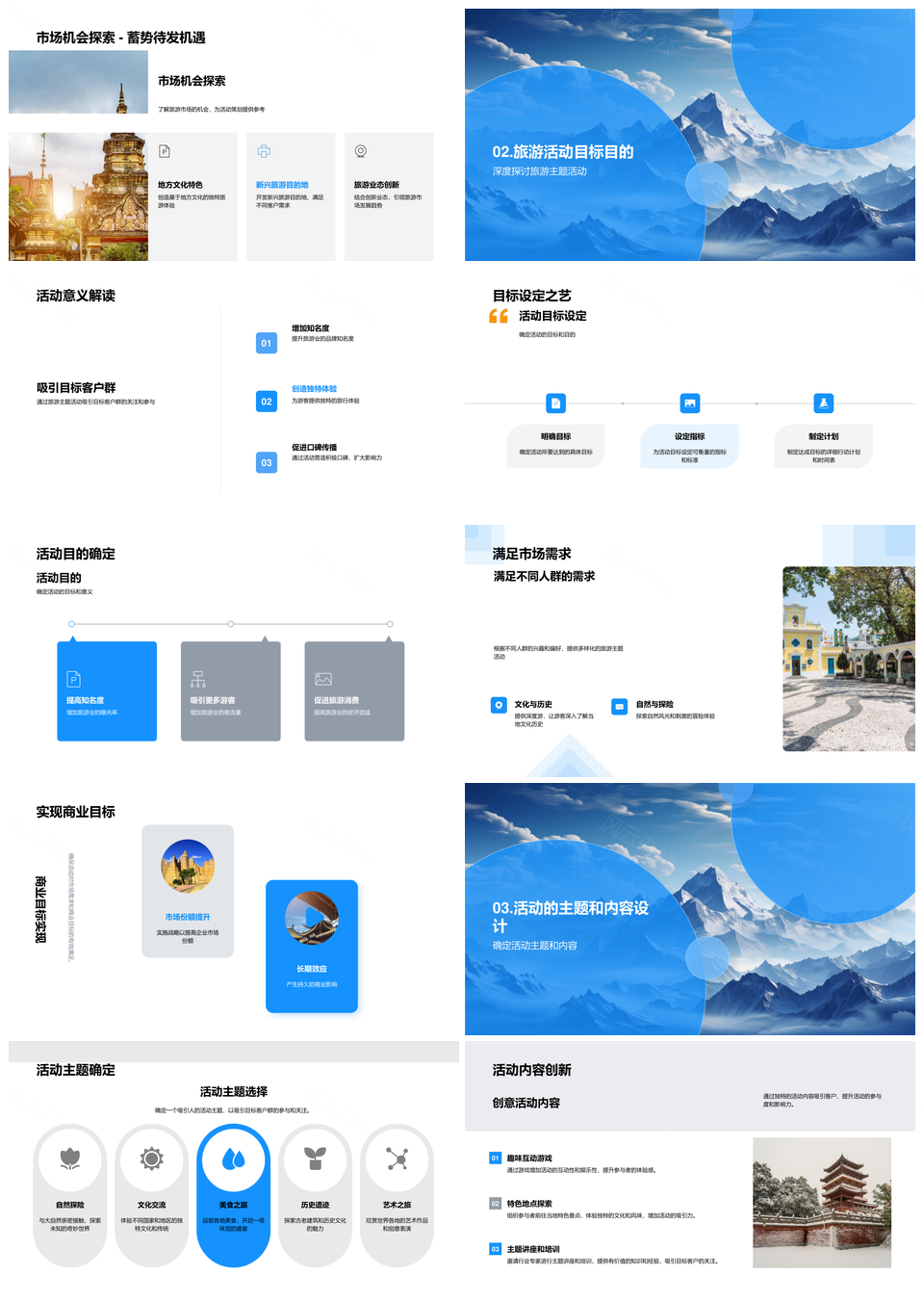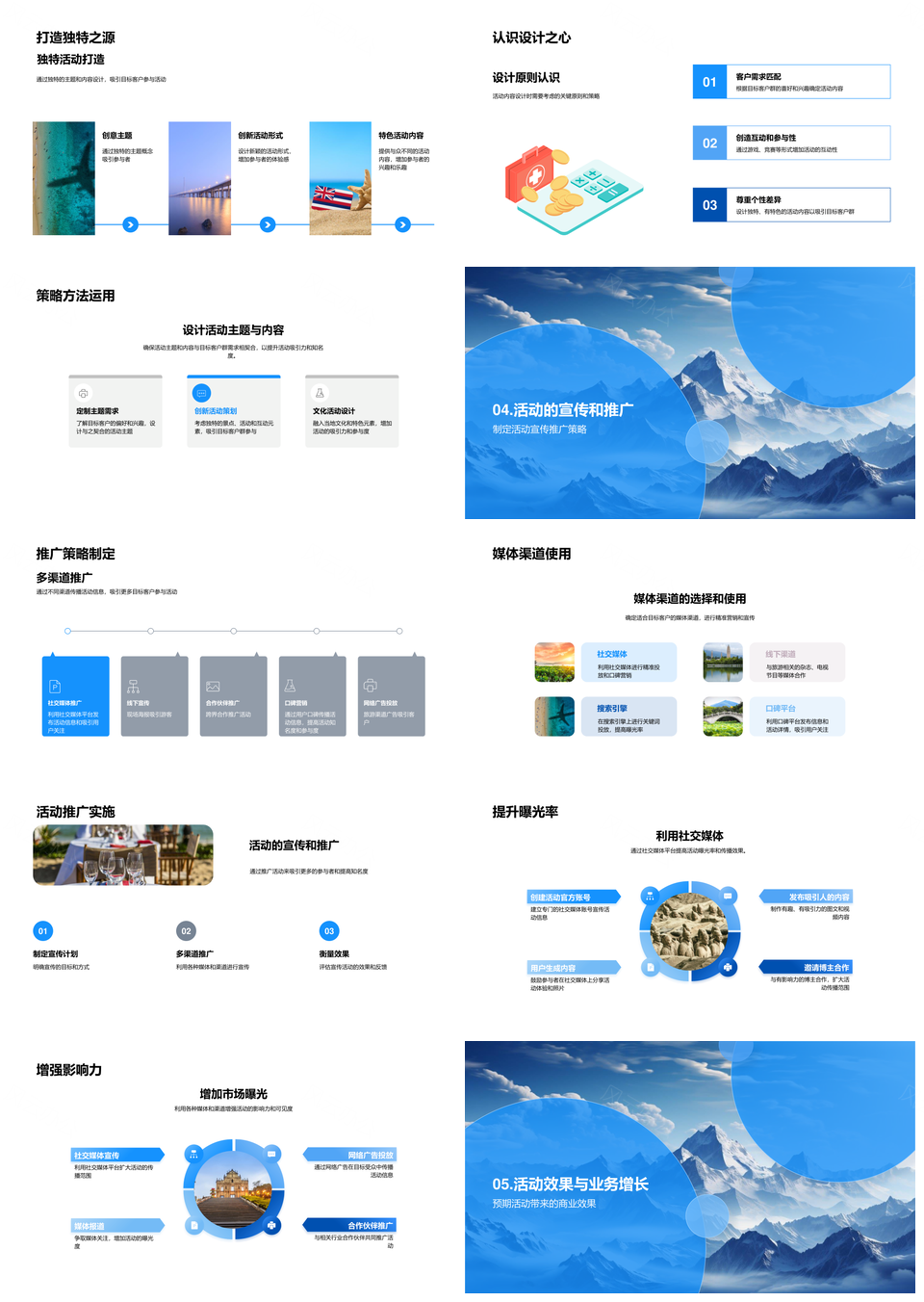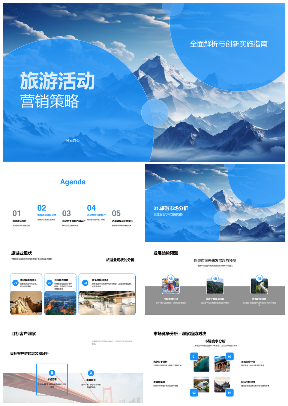 这是一张山脉旅游活动营销策略市场目标客群分析PPT模板,包含山脉、旅游活动、营销策略、市场、目标客群、分析等主题内容,也可用作山脉旅游活动营销策略市场目标客群、旅游活动营销策略市场目标客群、营销策略市场目标客群分析、市场目标客群分析、山脉旅游活动营销策略市场、旅游活动营销策略市场、营销策略市场目标客群、山脉旅游活动营销策略、旅游活动营销策略目标客群、市场目标客群、山脉旅游活动营销、旅游活动市场目标客群、营销策略市场分析、山脉旅游活动、目标客群分析等PPT场景使用。 风云办公提供的山脉旅游活动营销策略市场目标客群分析PPT模板,下载格式为pptx,一共32页,作品中文字及图均可以修改和编辑,图片更改请在作品中右键图片并更换,文字修改请直接点击文字进行修改。