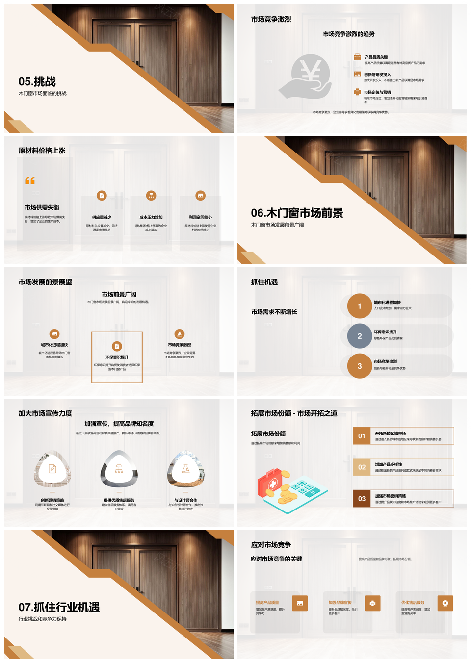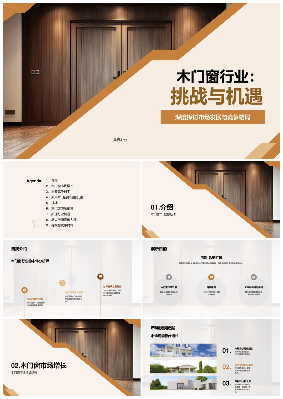 风云办公提供的木门窗市场趋势竞争格局与机遇挑战PPT模板,下载格式为pptx,一共35页,作品中文字及图均可以修改和编辑,图片更改请在作品中右键图片并更换,文字修改请直接点击文字进行修改。