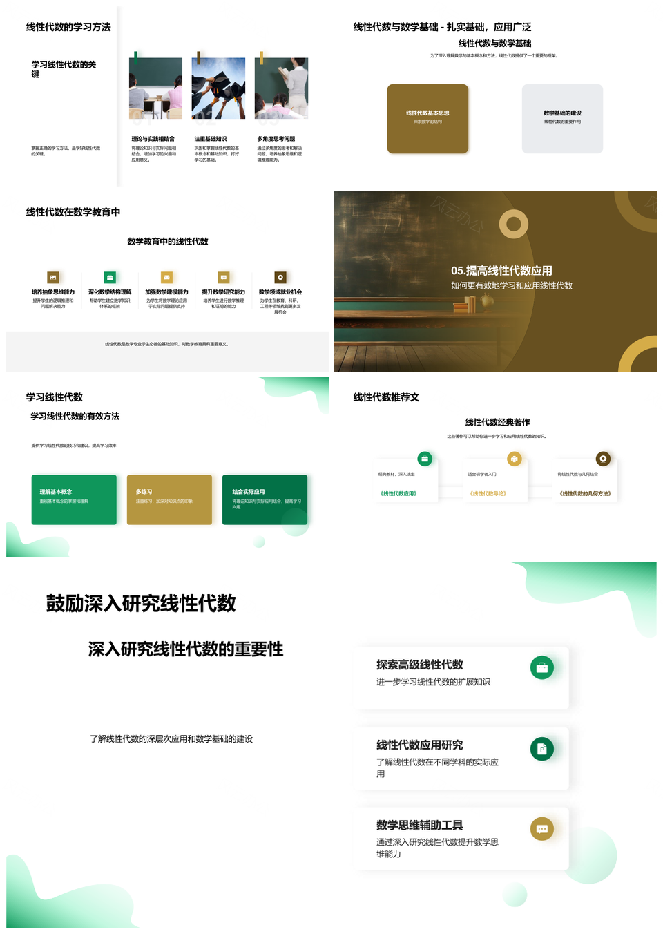 这是一张本科线性代数课堂教学矩阵方程向量空间变换基础PPT模板,包含本科、线性代数、课堂、教学、矩阵、方程、向量、空间、变换、基础等主题内容,也可用作本科线性代数课堂教学矩阵方程、线性代数课堂教学矩阵方程向量空间、课堂教学矩阵方程向量空间变换、矩阵方程向量空间变换基础、本科线性代数课堂教学、线性代数课堂教学矩阵方程、课堂教学矩阵方程向量空间、矩阵方程向量空间变换、向量空间变换基础、本科线性代数、线性代数课堂教学、课堂教学矩阵方程、矩阵方程向量空间、向量空间变换、变换基础等PPT场景使用。 风云办公提供的本科线性代数课堂教学矩阵方程向量空间变换基础PPT模板,下载格式为pptx,一共25页,作品中文字及图均可以修改和编辑,图片更改请在作品中右键图片并更换,文字修改请直接点击文字进行修改。