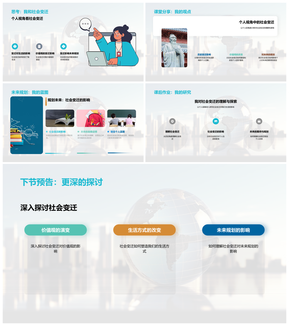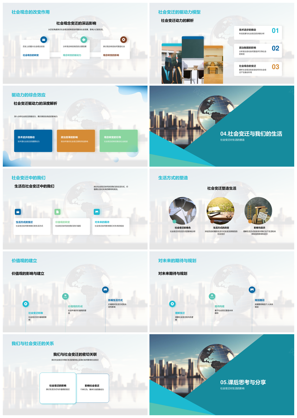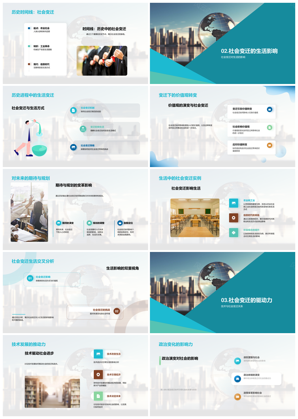这是一张社会历史教育技术革新与生活价值未来变迁PPT模板,包含社会、历史、教育、技术、革新、生活、价值、未来、变迁等主题内容,也可用作社会历史教育技术革新、历史教育技术革新生活、教育技术革新生活价值、技术革新生活价值未来、革新生活价值未来变迁、社会历史教育技术、历史教育技术革新、教育技术革新生活、技术革新生活价值、革新生活价值未来、社会历史教育、历史教育技术、教育技术革新、技术革新生活、生活价值未来等PPT场景使用。 风云办公提供的社会历史教育技术革新与生活价值未来变迁PPT模板,下载格式为pptx,一共33页,作品中文字及图均可以修改和编辑,图片更改请在作品中右键图片并更换,文字修改请直接点击文字进行修改。