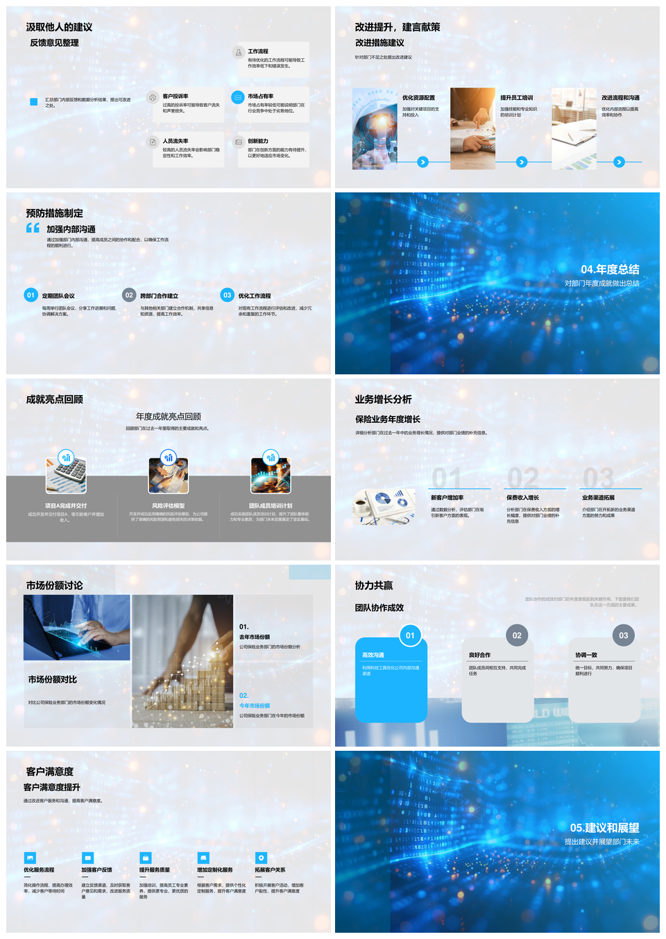 这是一张保险年报业绩团队未来路径KPI分析改进资源投入PPT模板,包含保险、年报、业绩、团队、未来、路径、KPI、分析、改进、资源、投入等主题内容,也可用作保险年报业绩团队、年报业绩团队未来、业绩团队未来路径、团队未来路径KPI、未来路径KPI分析、路径KPI分析改进、KPI分析改进资源、分析改进资源投入、保险年报业绩、年报业绩团队、业绩团队未来、团队未来路径、未来路径KPI、KPI分析改进、资源投入等PPT场景使用。 风云办公提供的保险年报业绩团队未来路径KPI分析改进资源投入PPT模板,下载格式为pptx,一共33页,作品中文字及图均可以修改和编辑,图片更改请在作品中右键图片并更换,文字修改请直接点击文字进行修改。