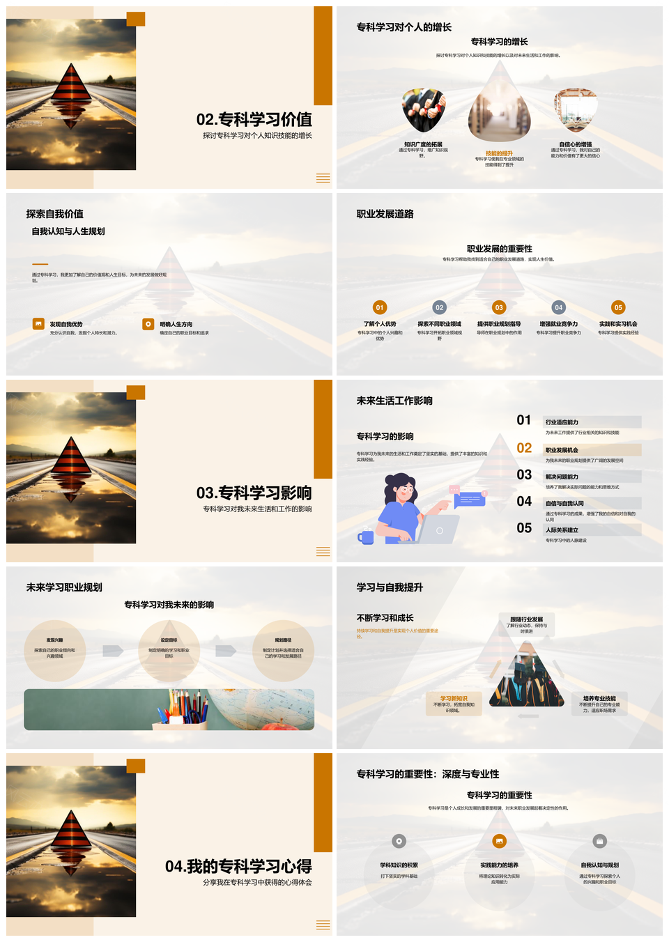 风云办公提供的专科人生职业规划与毕业答辩提升PPT模板,下载格式为pptx,一共24页,作品中文字及图均可以修改和编辑,图片更改请在作品中右键图片并更换,文字修改请直接点击文字进行修改。