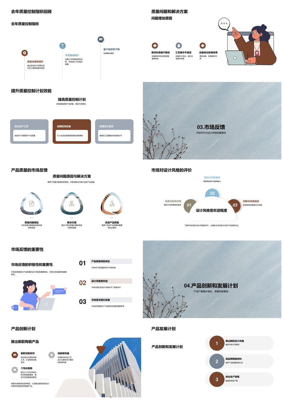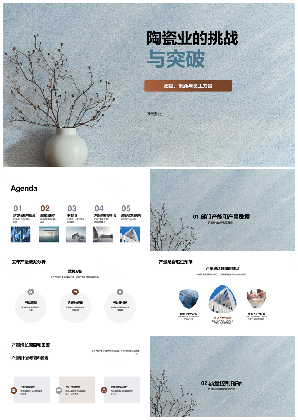 这是一张陶瓷制品部门生产主管总结产能增长与质控PPT模板,包含陶瓷制品部门、生产主管、总结、产能增长、质控等主题内容,也可用作陶瓷制品部门生产主管总结产能增长、陶瓷制品部门生产主管总结、部门生产主管总结产能增长、生产主管总结产能增长质控、陶瓷制品部门产能增长质控、部门生产主管总结产能、生产主管总结产能增长、总结产能增长与质控、陶瓷制品部门生产主管、部门生产主管质控、生产主管产能增长、产能增长质控总结、陶瓷制品部门产能、生产主管质控、部门产能增长等PPT场景使用。 风云办公提供的陶瓷制品部门生产主管总结产能增长与质控PPT模板,下载格式为pptx,一共23页,作品中文字及图均可以修改和编辑,图片更改请在作品中右键图片并更换,文字修改请直接点击文字进行修改。
