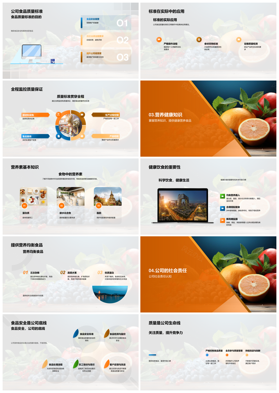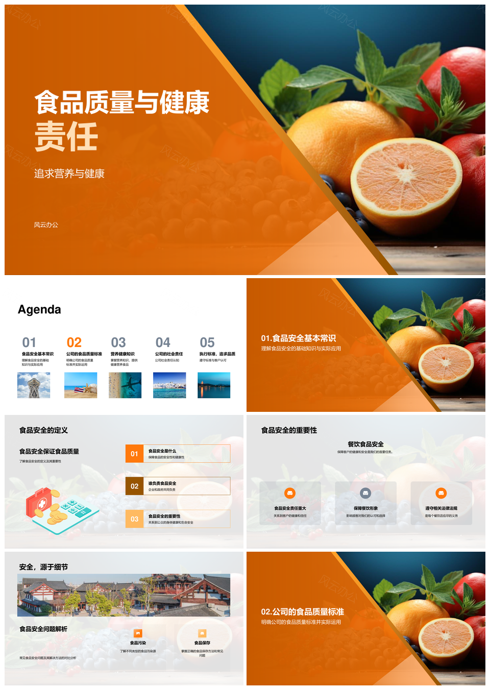 风云办公提供的食品质量健康责任与公司营养饮食标准PPT模板,下载格式为pptx,一共23页,作品中文字及图均可以修改和编辑,图片更改请在作品中右键图片并更换,文字修改请直接点击文字进行修改。
