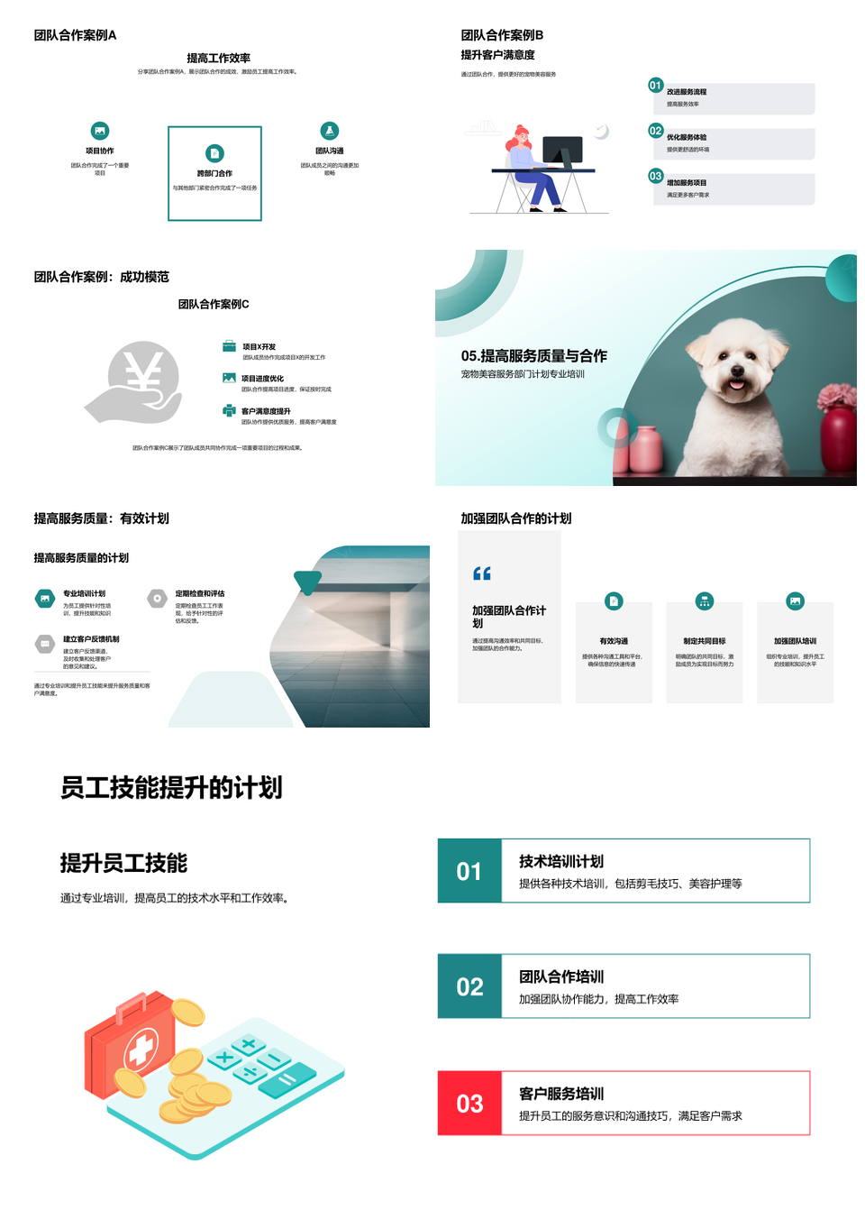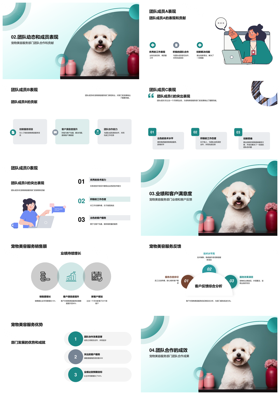 这是一张宠物美容服务部月业绩团队协作满意度盘点PPT模板,包含宠物、美容、服务部、月业绩、团队、协作、满意度、盘点等主题内容,也可用作宠物美容服务部月业绩团队协作满意度、服务部月业绩团队协作满意度、月业绩团队协作满意度盘点、宠物美容服务部月业绩、团队协作满意度盘点、服务部团队协作满意度、月业绩团队协作、满意度盘点、宠物美容服务部、团队协作满意度、服务部月业绩、月业绩团队、团队协作、满意度、盘点等PPT场景使用。 风云办公提供的宠物美容服务部月业绩团队协作满意度盘点PPT模板,下载格式为pptx,一共25页,作品中文字及图均可以修改和编辑,图片更改请在作品中右键图片并更换,文字修改请直接点击文字进行修改。