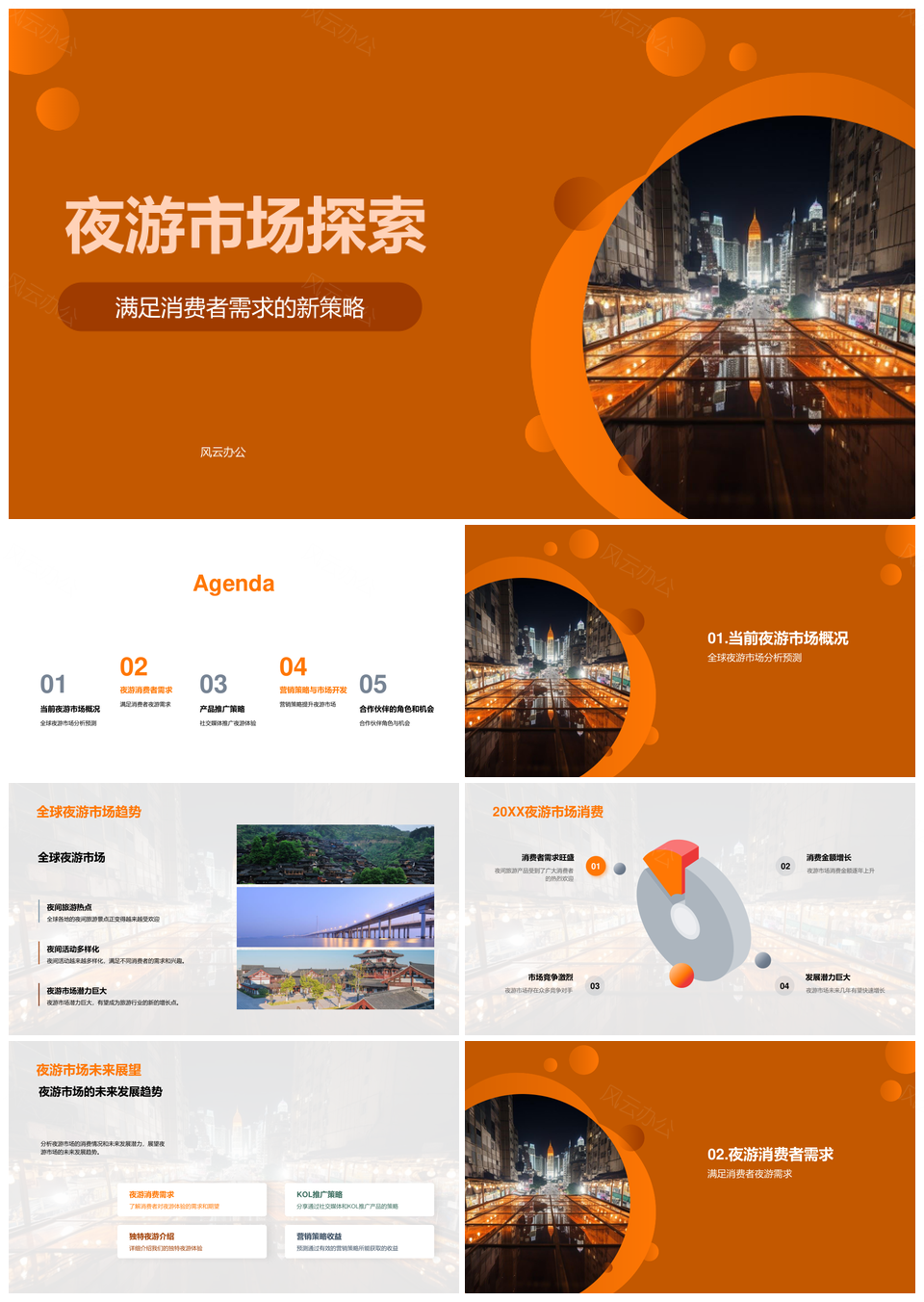 风云办公提供的全球夜游市场趋势与需求营销策略探索PPT模板,下载格式为pptx,一共23页,作品中文字及图均可以修改和编辑,图片更改请在作品中右键图片并更换,文字修改请直接点击文字进行修改。