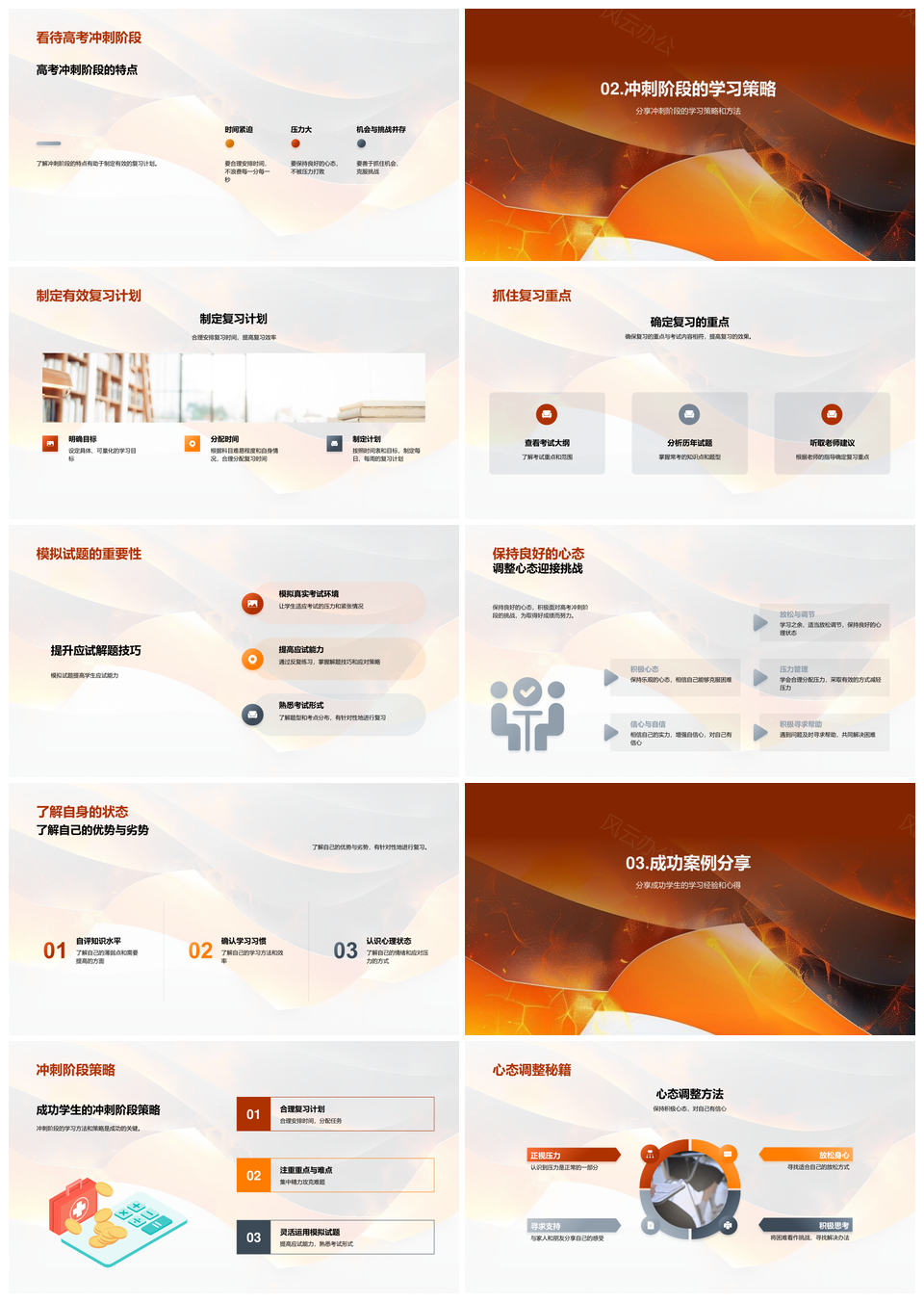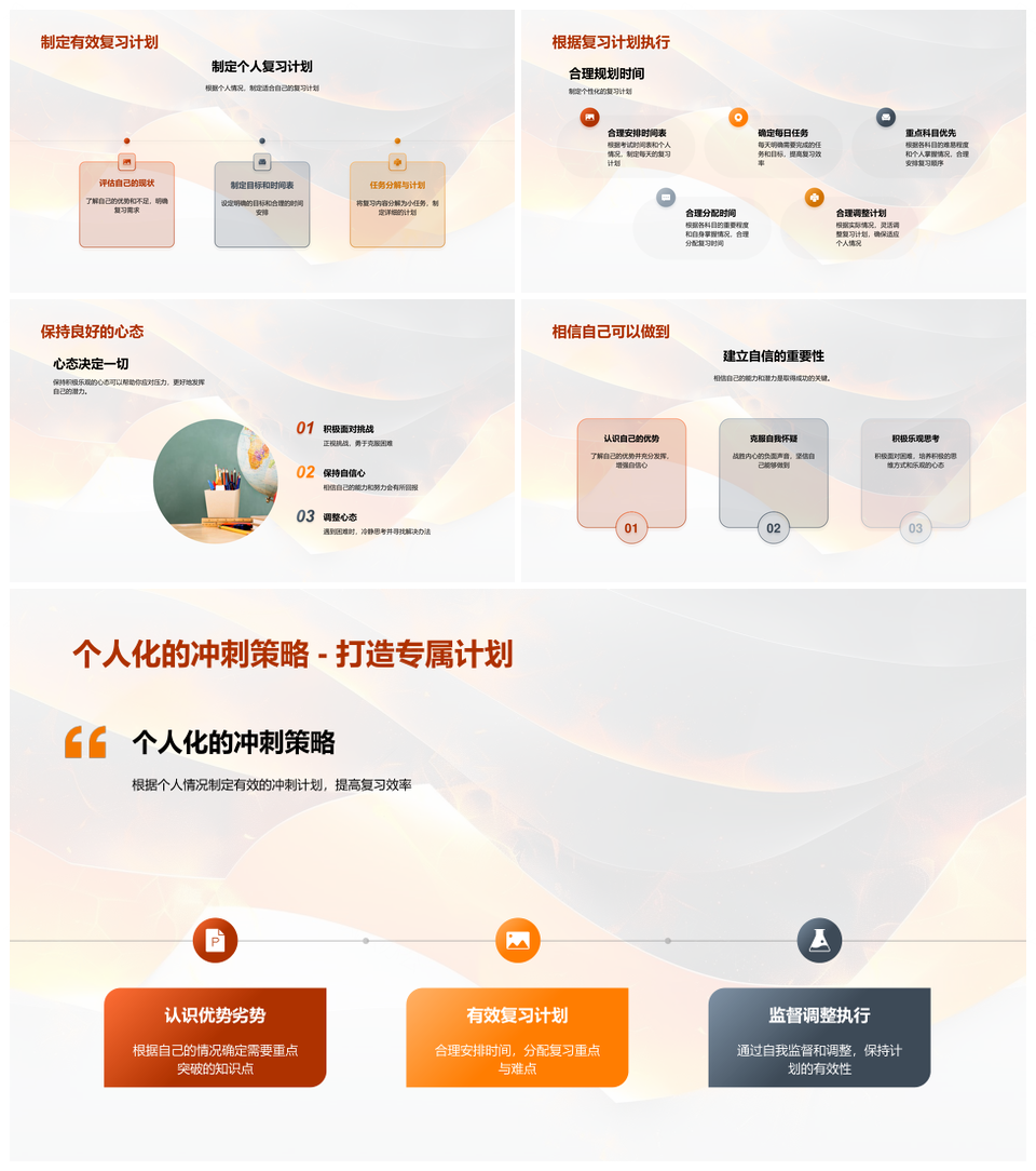 这是一张高考冲刺策略时间管理心态调整复习计划PPT模板,包含高考冲刺、策略、时间管理、心态调整、复习计划等主题内容,也可用作高考冲刺策略时间管理、高考冲刺策略复习计划、高考冲刺时间管理复习计划、高考策略时间管理复习计划、冲刺策略时间管理心态调整、时间管理心态调整复习计划、高考冲刺策略心态调整、冲刺策略时间管理复习计划、高考冲刺时间管理心态调整、高考冲刺策略复习计划、高考时间管理心态调整、高考冲刺心态调整、冲刺策略心态调整、时间管理复习计划、心态调整复习计划等PPT场景使用。 风云办公提供的高考冲刺策略时间管理心态调整复习计划PPT模板,下载格式为pptx,一共33页,作品中文字及图均可以修改和编辑,图片更改请在作品中右键图片并更换,文字修改请直接点击文字进行修改。