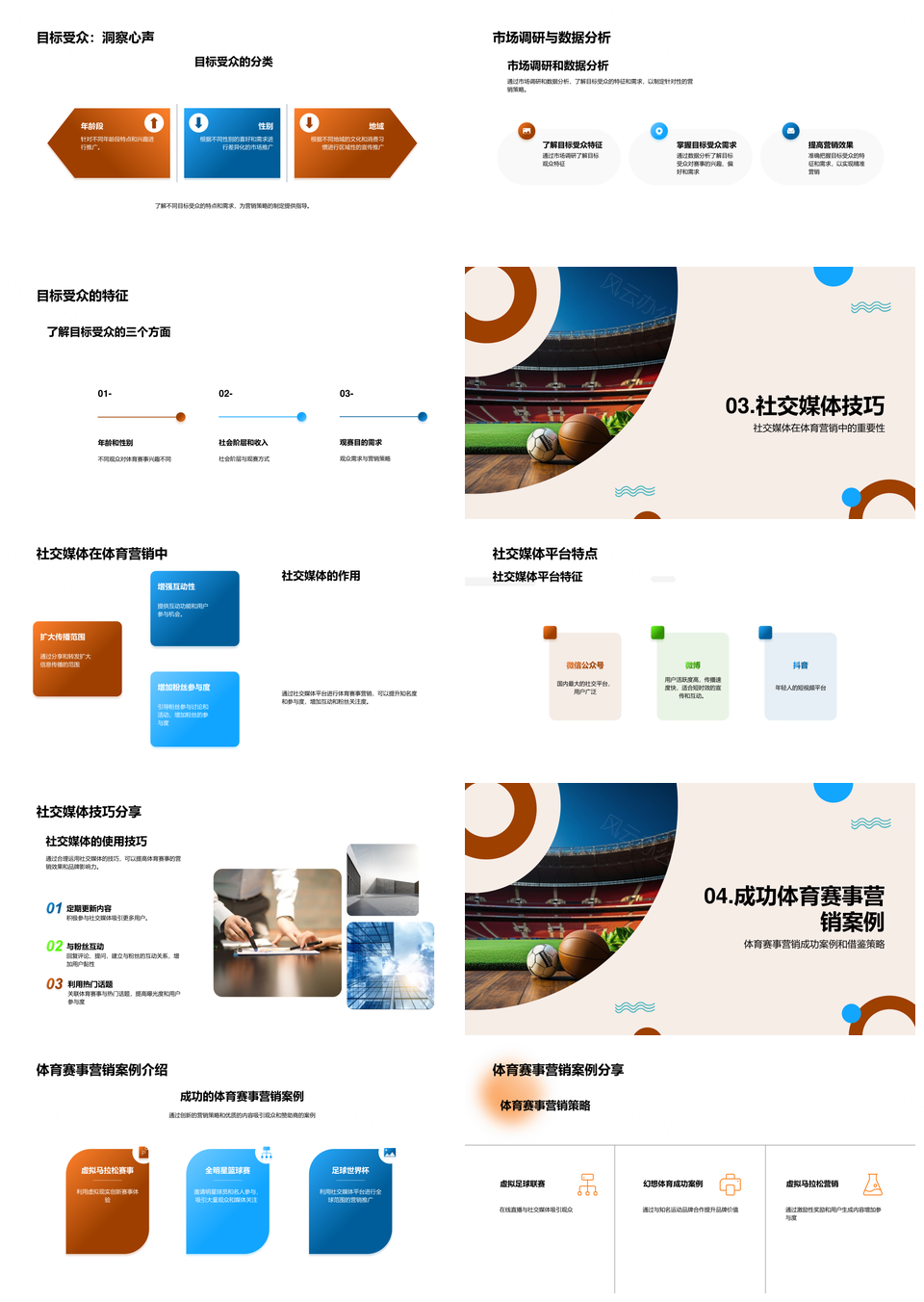这是一张体育赛事营销策略目标受众市场调研分类PPT模板,包含体育赛事、营销策略、目标受众、市场调研、分类等主题内容,也可用作体育赛事营销策略目标受众市场调研、体育赛事营销策略目标受众分类、体育赛事营销策略市场调研分类、体育赛事目标受众市场调研分类、营销策略目标受众市场调研分类、体育赛事营销策略目标受众、体育赛事营销策略市场调研、体育赛事目标受众市场调研、营销策略目标受众市场调研、体育赛事市场调研分类、营销策略市场调研分类、体育赛事营销策略、体育赛事目标受众、目标受众市场调研、市场调研分类等PPT场景使用。 风云办公提供的体育赛事营销策略目标受众市场调研分类PPT模板,下载格式为pptx,一共23页,作品中文字及图均可以修改和编辑,图片更改请在作品中右键图片并更换,文字修改请直接点击文字进行修改。