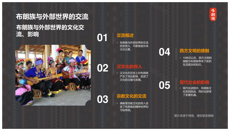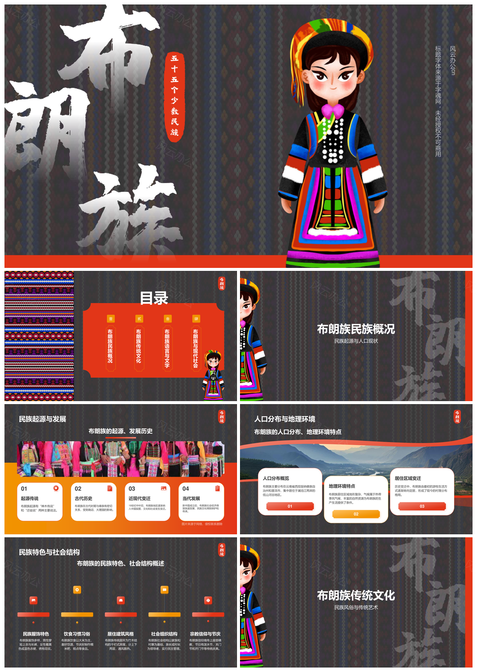 风云办公提供的布朗族历史文化团结交流地理分布概况PPT模板,下载格式为pptx,一共19页,作品中文字及图均可以修改和编辑,图片更改请在作品中右键图片并更换,文字修改请直接点击文字进行修改。