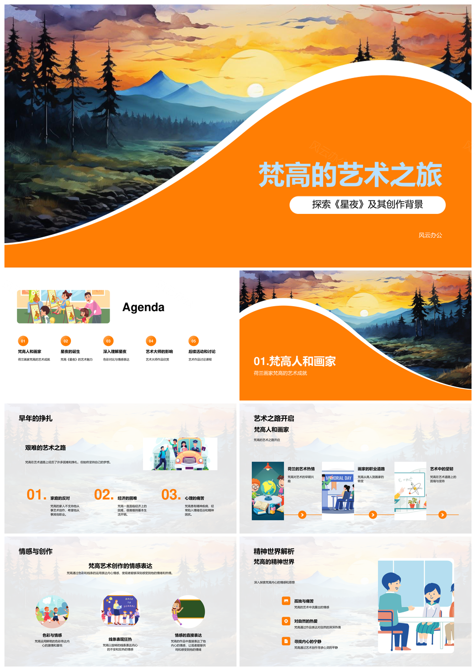 风云办公提供的梵高星夜艺术之旅色彩旋转线条情感PPT模板,下载格式为pptx,一共33页,作品中文字及图均可以修改和编辑,图片更改请在作品中右键图片并更换,文字修改请直接点击文字进行修改。