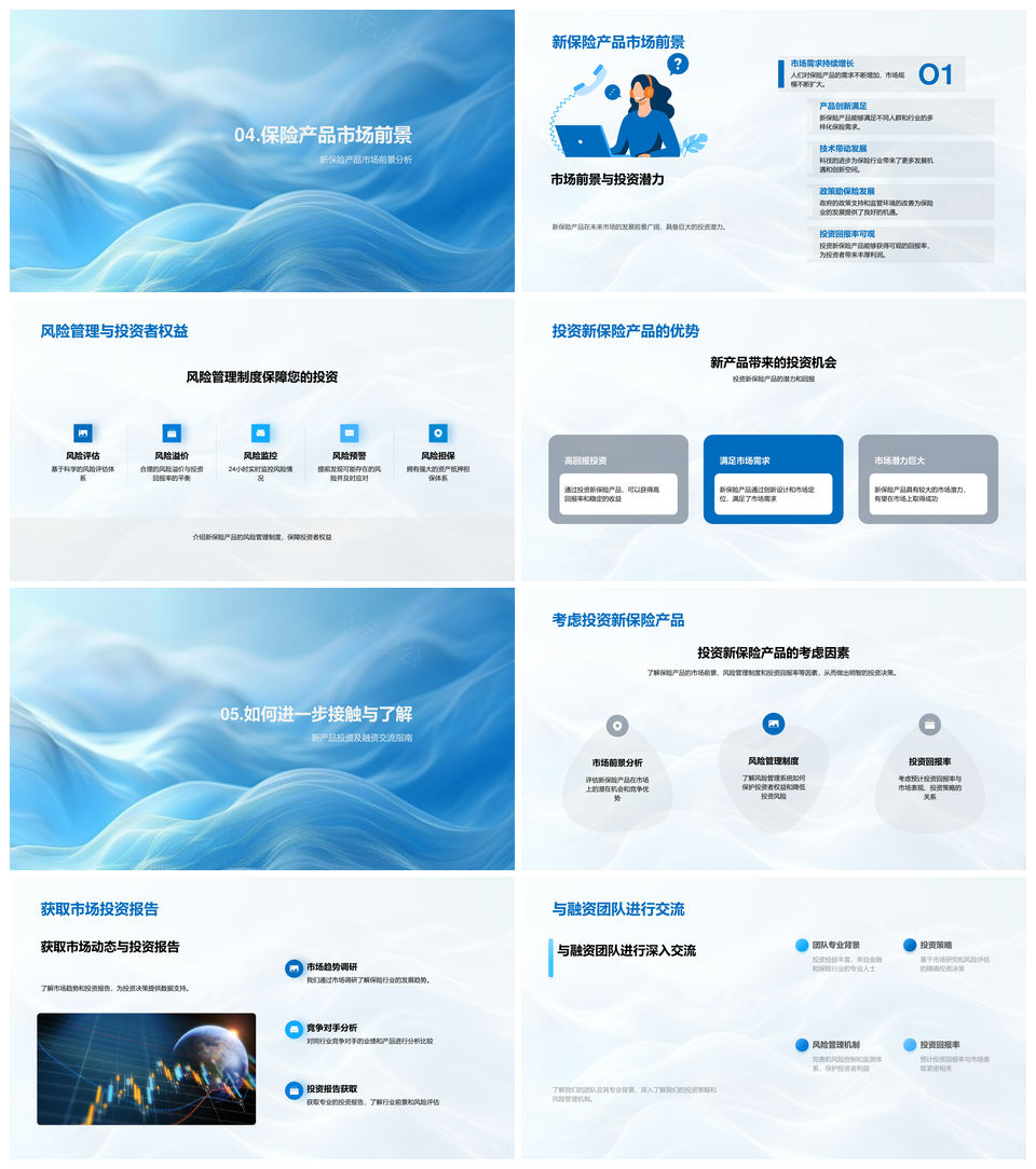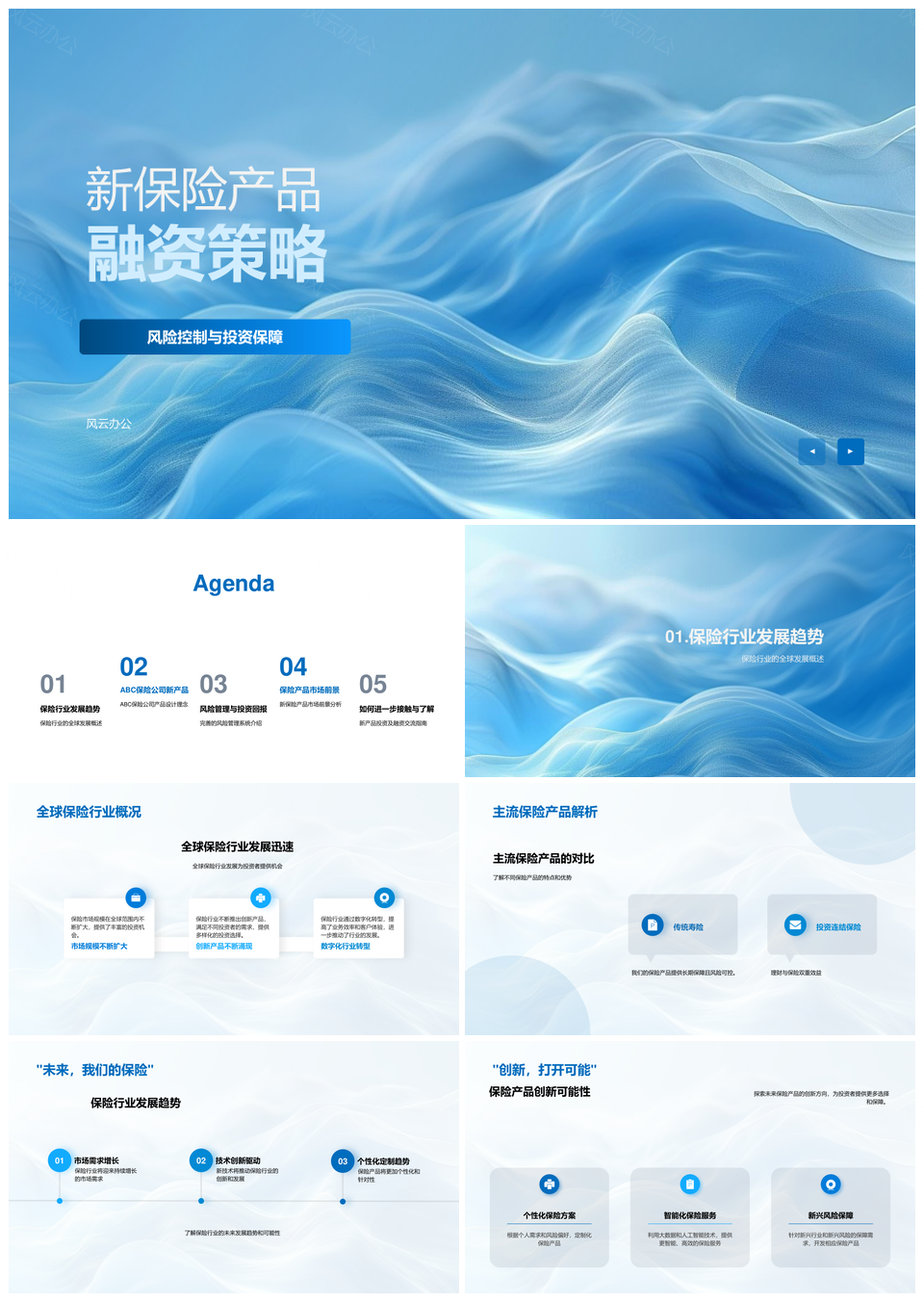 风云办公提供的新保险产品融资策略风控投保趋势前景PPT模板,下载格式为pptx,一共26页,作品中文字及图均可以修改和编辑,图片更改请在作品中右键图片并更换,文字修改请直接点击文字进行修改。