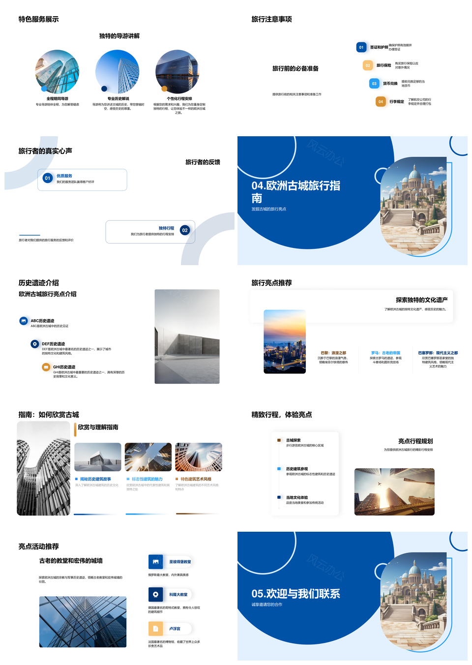 这是一张欧洲古城历史建筑艺术之旅探秘专业行程团队服务PPT模板,包含欧洲、古城、历史、建筑、艺术、之旅、探秘、专业、行程、团队、服务等主题内容,也可用作欧洲古城历史建筑艺术之旅、古城历史建筑艺术之旅、历史建筑艺术之旅探秘、建筑艺术之旅探秘专业、艺术之旅探秘专业行程、探秘专业行程团队服务、欧洲古城历史建筑艺术、古城历史建筑艺术探秘、历史艺术之旅专业行程、欧洲古城探秘专业团队、建筑艺术探秘专业服务、欧洲历史建筑专业行程、古城艺术之旅团队服务、探秘专业团队服务、历史建筑之旅专业行程等PPT场景使用。 风云办公提供的欧洲古城历史建筑艺术之旅探秘专业行程团队服务PPT模板,下载格式为pptx,一共33页,作品中文字及图均可以修改和编辑,图片更改请在作品中右键图片并更换,文字修改请直接点击文字进行修改。