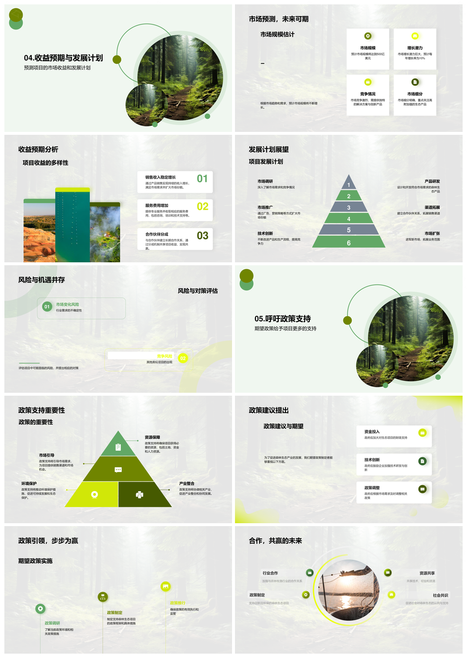 风云办公提供的绿色商业森林生态市场趋势与收益预期PPT模板,下载格式为pptx,一共28页,作品中文字及图均可以修改和编辑,图片更改请在作品中右键图片并更换,文字修改请直接点击文字进行修改。