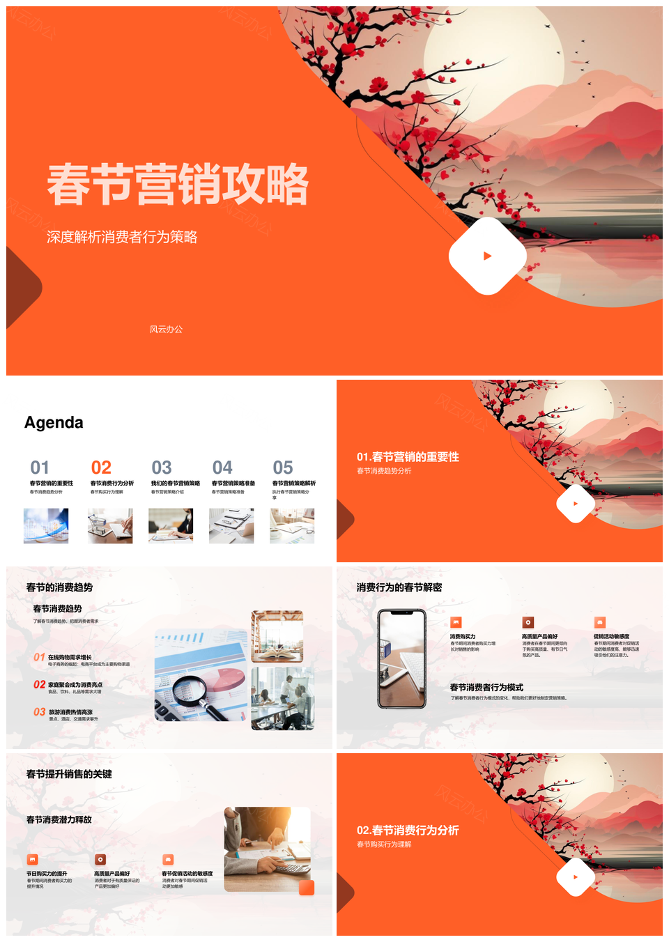 风云办公提供的春节营销攻略消费趋势促销活动业绩PPT模板,下载格式为pptx,一共23页,作品中文字及图均可以修改和编辑,图片更改请在作品中右键图片并更换,文字修改请直接点击文字进行修改。
