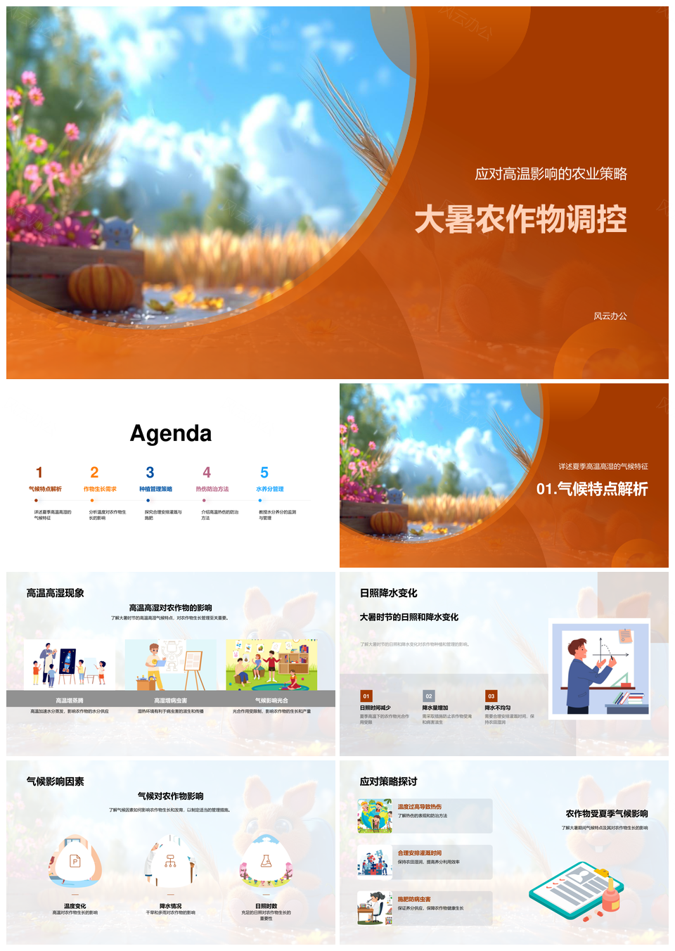 风云办公提供的大暑农作物高温调控农业策略PPT模板,下载格式为pptx,一共33页,作品中文字及图均可以修改和编辑,图片更改请在作品中右键图片并更换,文字修改请直接点击文字进行修改。