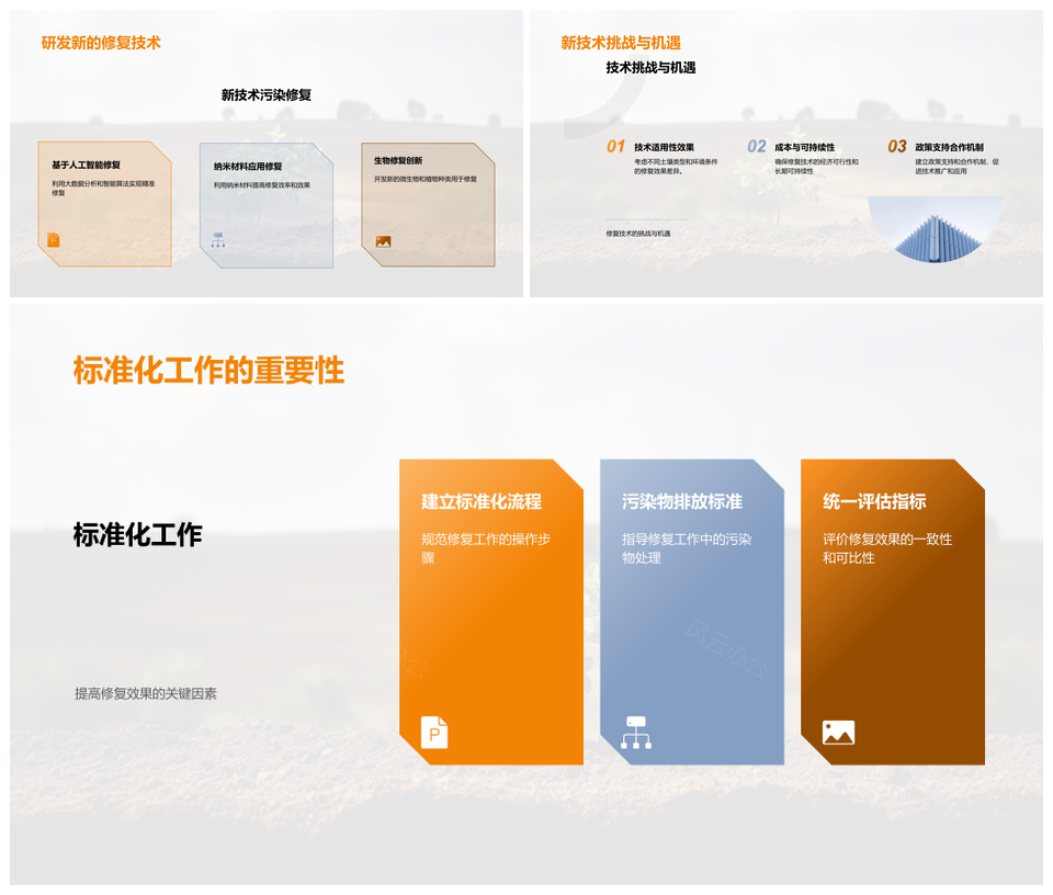 这是一张土壤污染物理化学生物修复技术创新前景PPT模板,包含土壤污染、物理、化学、生物、修复技术、创新前景等主题内容,也可用作土壤污染物理化学生物修复技术、物理化学生物修复技术创新、生物修复技术创新前景、土壤污染修复技术创新、污染物理化学生物修复、土壤化学生物修复技术、化学生物修复技术创新、土壤污染修复技术前景、污染物理化学生物技术、土壤污染生物修复前景、物理化学生物技术前景、修复技术创新前景、土壤污染技术创新、化学生物修复前景、生物技术创新前景等PPT场景使用。 风云办公提供的土壤污染物理化学生物修复技术创新前景PPT模板,下载格式为pptx,一共31页,作品中文字及图均可以修改和编辑,图片更改请在作品中右键图片并更换,文字修改请直接点击文字进行修改。