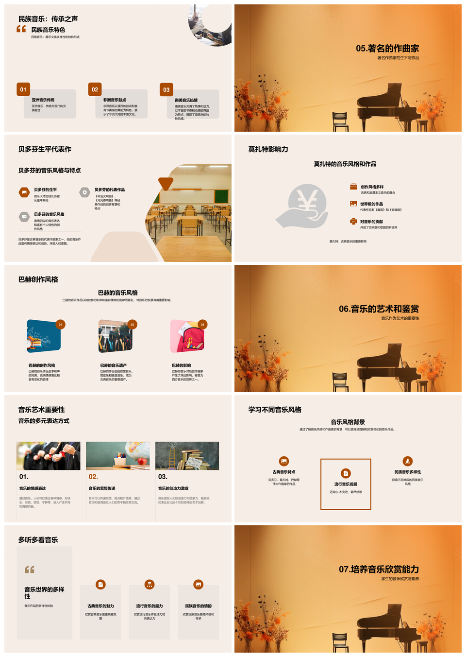 风云办公提供的音乐风格作曲家乐器节奏鉴赏之旅PPT模板,下载格式为pptx,一共31页,作品中文字及图均可以修改和编辑,图片更改请在作品中右键图片并更换,文字修改请直接点击文字进行修改。