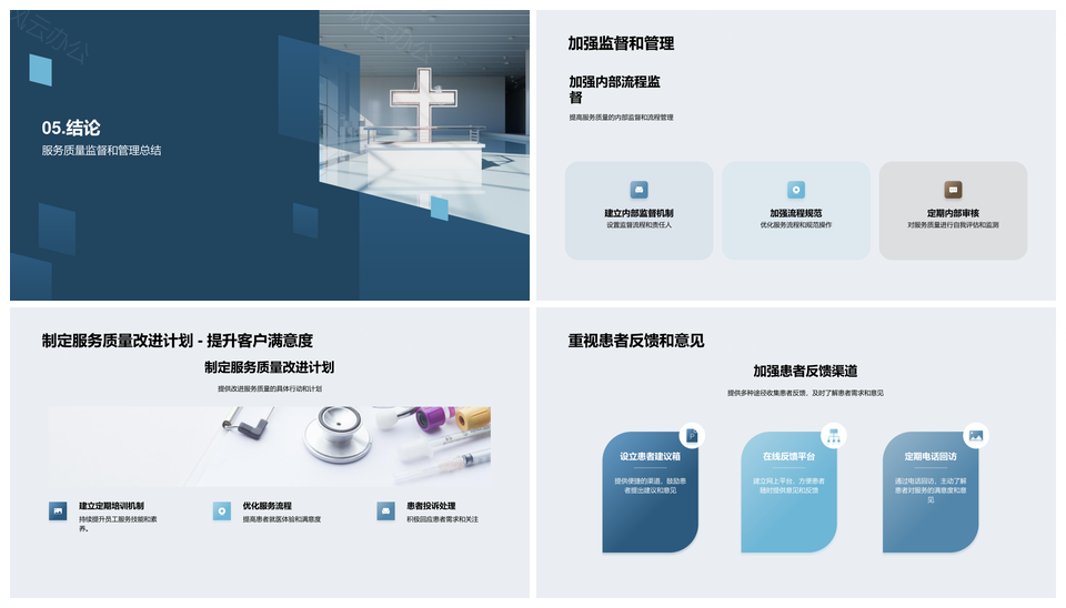 这是一张综合医院服务质量患者调查改进分析建筑评估PPT模板,包含综合医院、服务质量、患者、调查、改进、分析、建筑、评估等主题内容,也可用作综合医院服务质量改进分析、患者调查改进分析建筑评估、服务质量患者调查改进分析、综合医院患者调查改进分析、综合医院改进分析建筑评估、患者调查改进分析建筑评估、综合医院服务质量、患者调查改进分析、改进分析建筑评估、服务质量患者调查、综合医院建筑评估、服务质量改进分析、患者调查建筑评估、服务质量建筑评估、综合医院改进分析等PPT场景使用。 风云办公提供的综合医院服务质量患者调查改进分析建筑评估PPT模板,下载格式为pptx,一共22页,作品中文字及图均可以修改和编辑,图片更改请在作品中右键图片并更换,文字修改请直接点击文字进行修改。