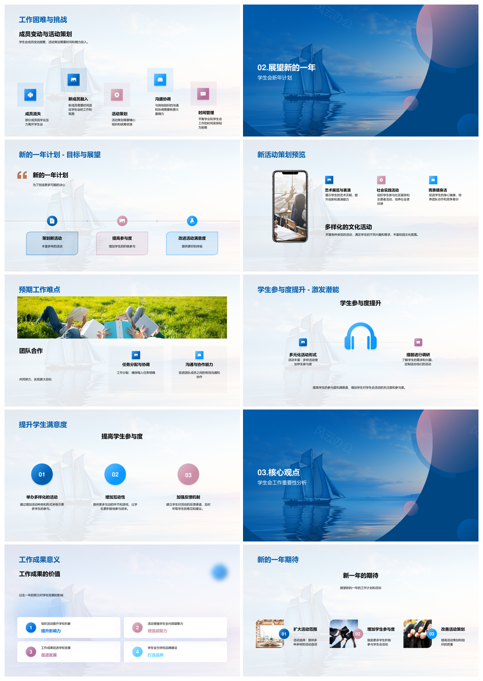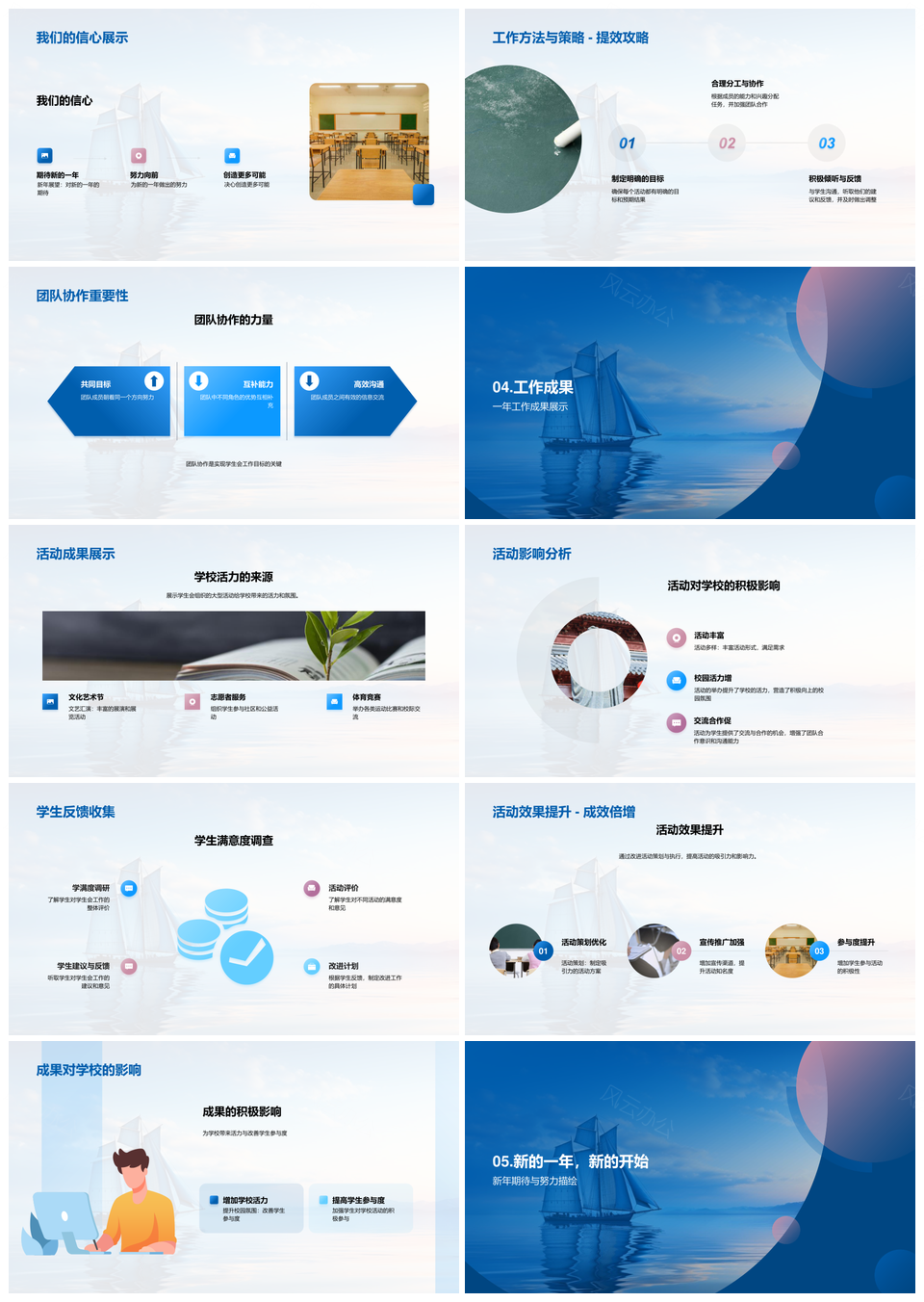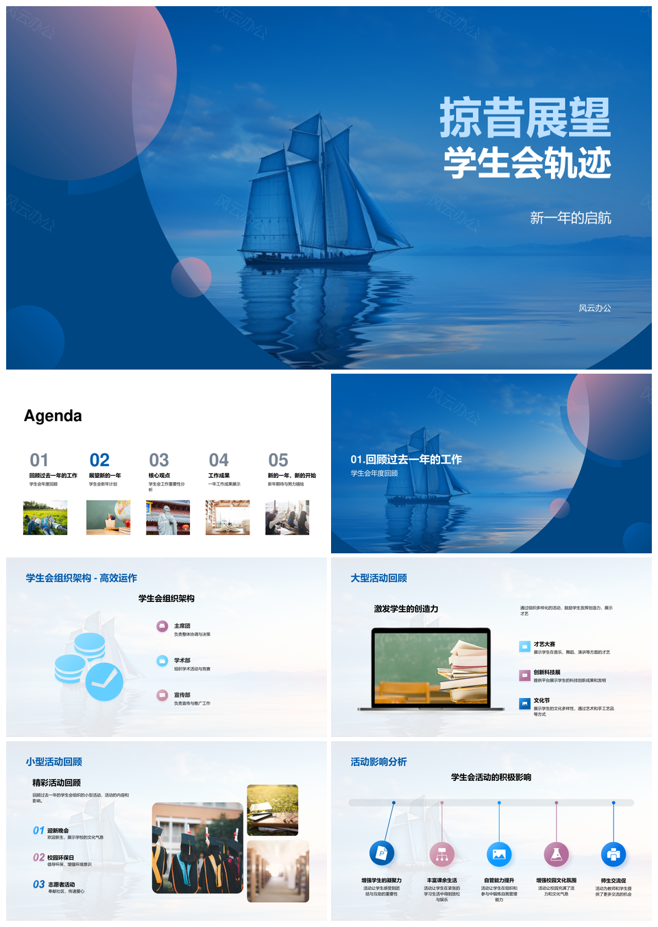 风云办公提供的学生会新年扬帆展成果启新程PPT模板,下载格式为pptx,一共33页,作品中文字及图均可以修改和编辑,图片更改请在作品中右键图片并更换,文字修改请直接点击文字进行修改。