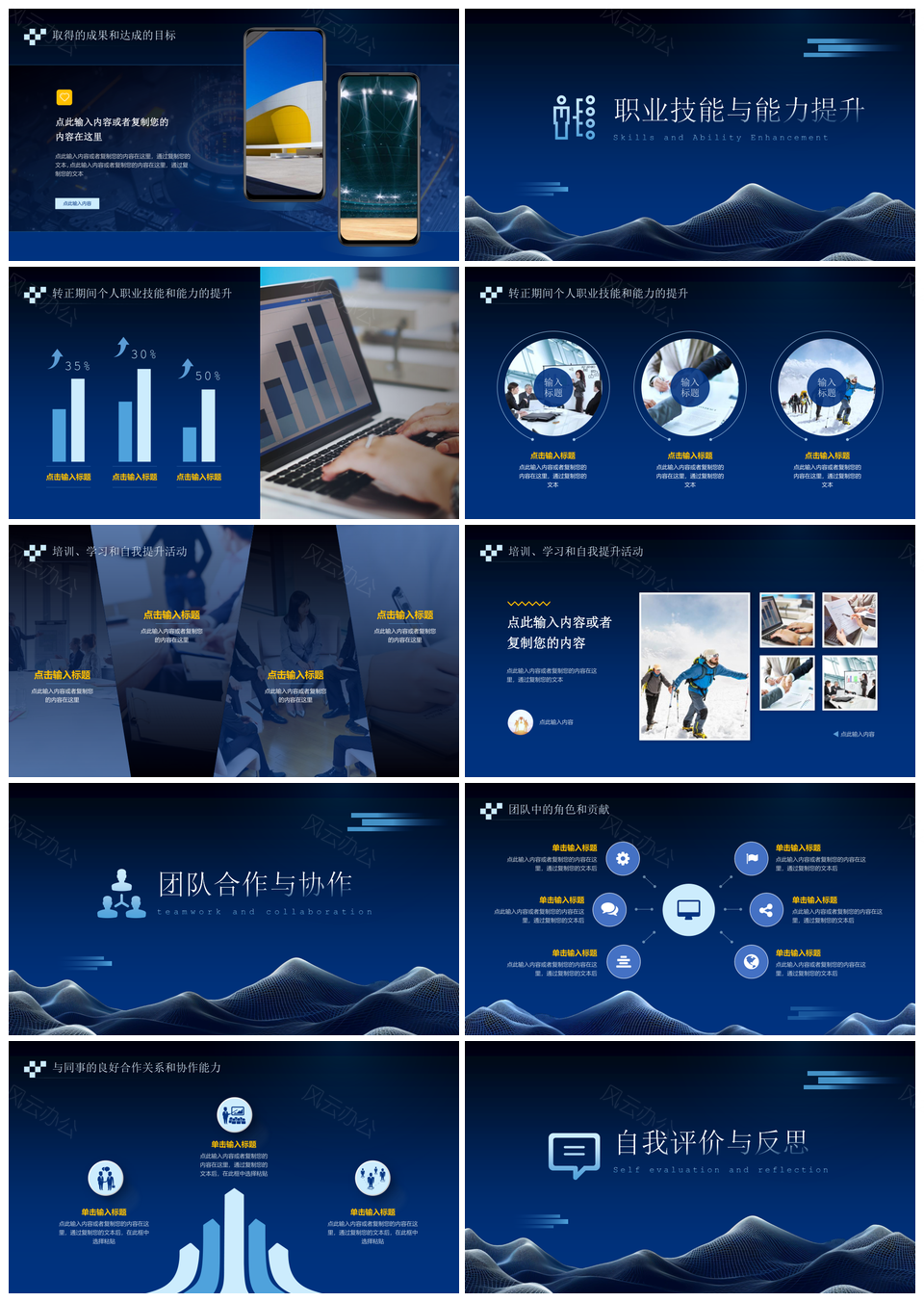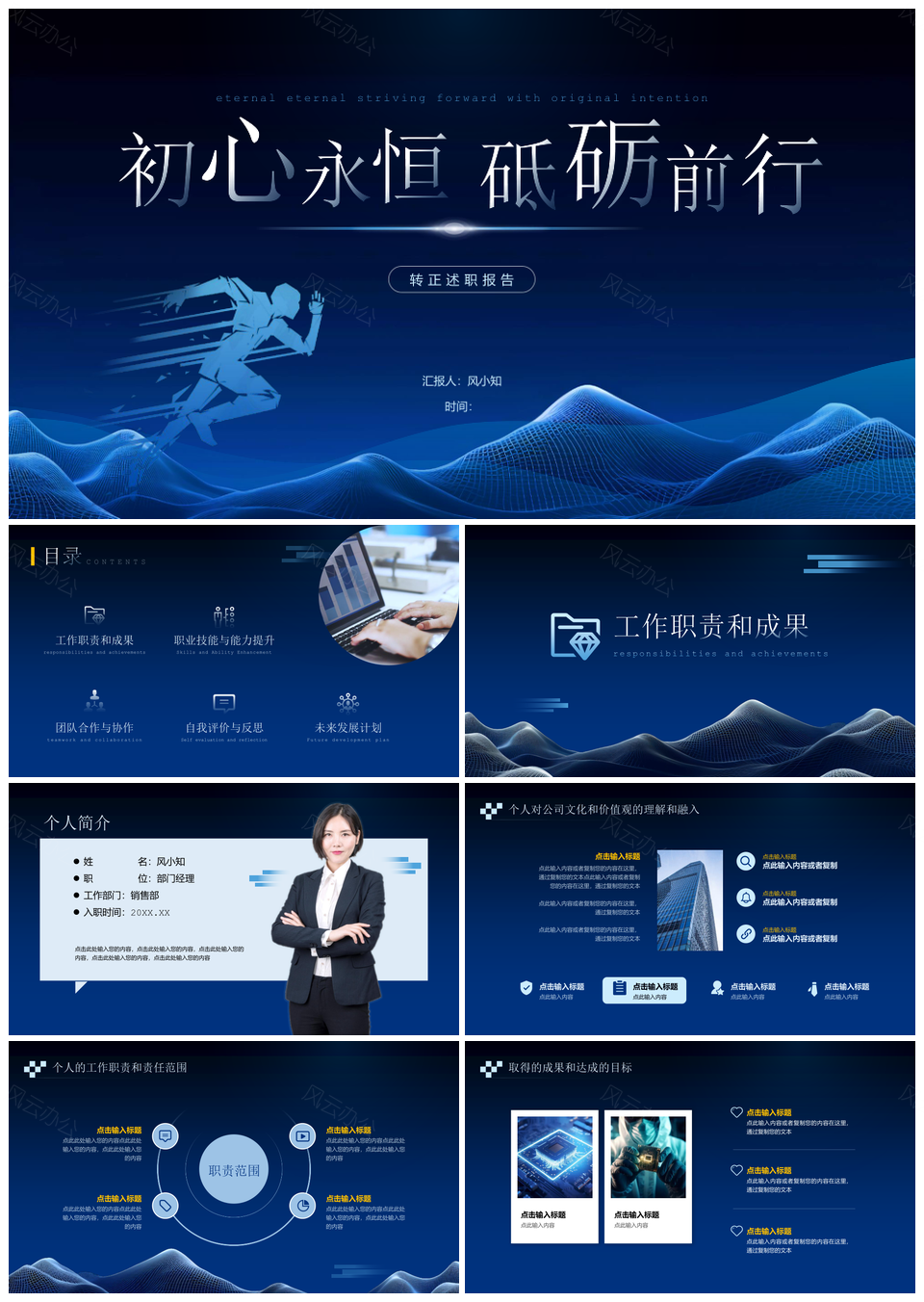 风云办公提供的蓝色商务深色渐变转正述职报告PPT模板,下载格式为pptx,一共25页,作品中文字及图均可以修改和编辑,图片更改请在作品中右键图片并更换,文字修改请直接点击文字进行修改。