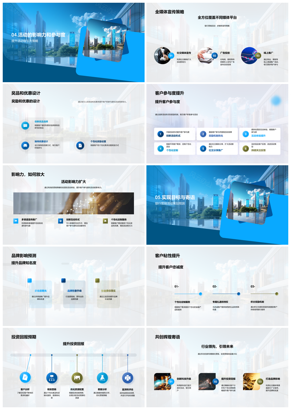 这是一张银行营销科技赋能客户参与活动策划解析PPT模板,包含银行、营销、科技、赋能、客户、参与、活动、策划、解析等主题内容,也可用作银行营销科技赋能客户、营销科技赋能客户参与、科技赋能客户参与活动、赋能客户参与活动策划、客户参与活动策划解析、银行营销科技赋能、营销科技赋能客户、科技赋能客户参与、赋能客户参与活动、客户参与活动策划、参与活动策划解析、银行营销科技、营销科技赋能、科技赋能客户、赋能客户参与、客户参与活动、参与活动策划、活动策划解析等PPT场景使用。 风云办公提供的银行营销科技赋能客户参与活动策划解析PPT模板,下载格式为pptx,一共28页,作品中文字及图均可以修改和编辑,图片更改请在作品中右键图片并更换,文字修改请直接点击文字进行修改。