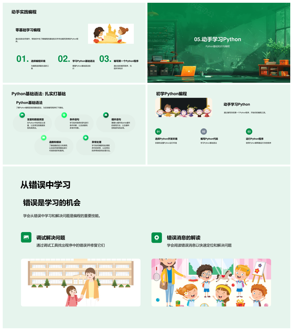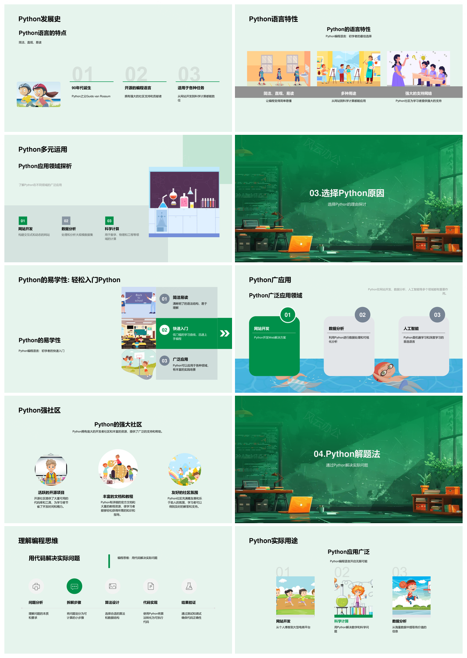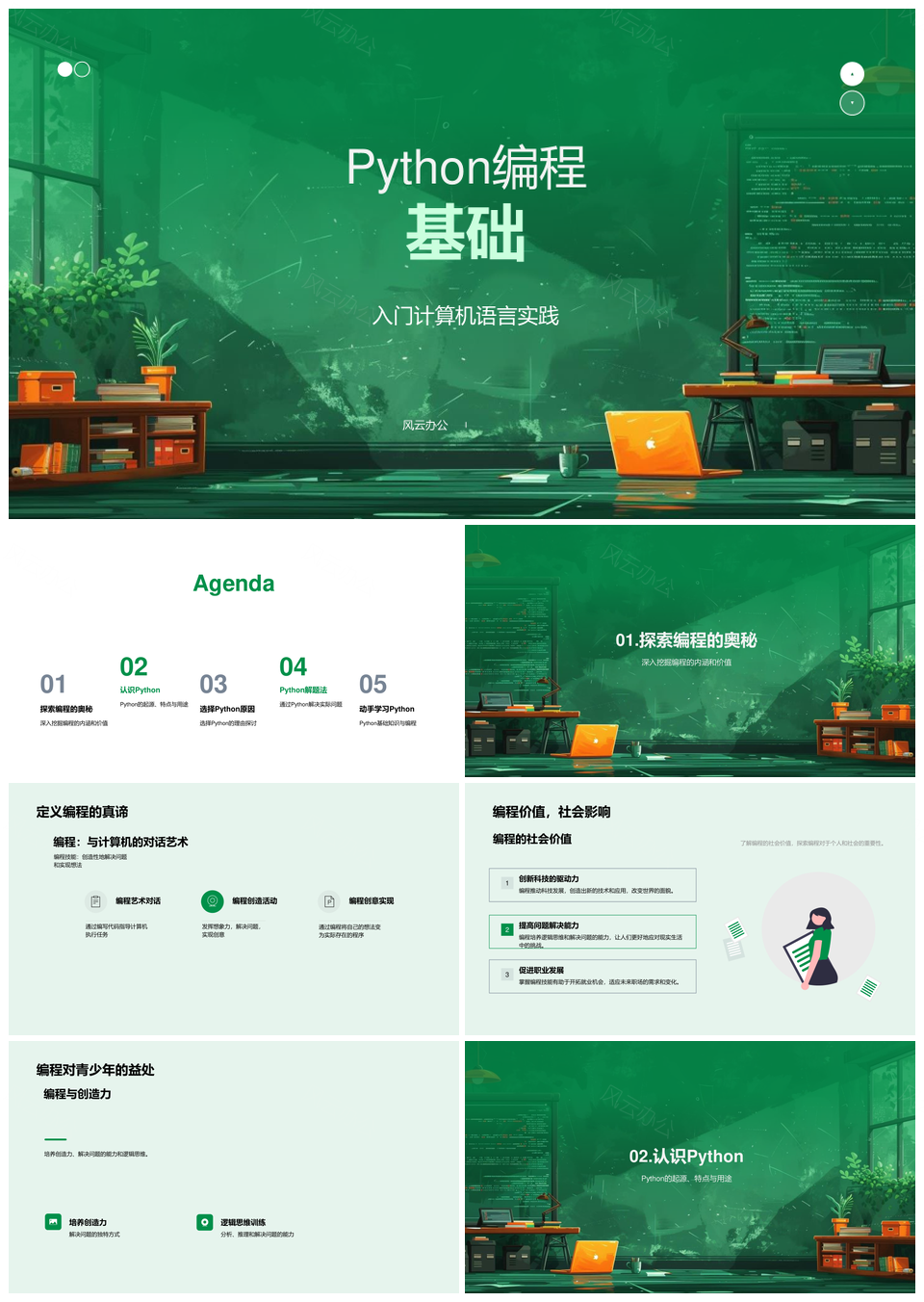 这是一张Python编程思维入门与调试社区创造力PPT模板,包含Python、编程思维、入门、调试、社区、创造力等主题内容,也可用作Python编程思维入门、编程思维入门调试、Python编程思维、编程思维入门、思维入门调试、调试社区创造力、Python编程、编程思维、思维入门、入门调试、调试社区、社区创造力、Python编程入门、入门调试社区、编程思维调试等PPT场景使用。 风云办公提供的Python编程思维入门与调试社区创造力PPT模板,下载格式为pptx,一共23页,作品中文字及图均可以修改和编辑,图片更改请在作品中右键图片并更换,文字修改请直接点击文字进行修改。