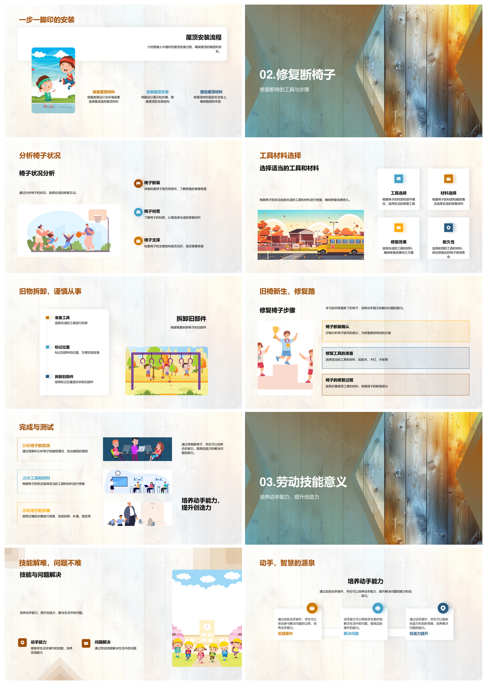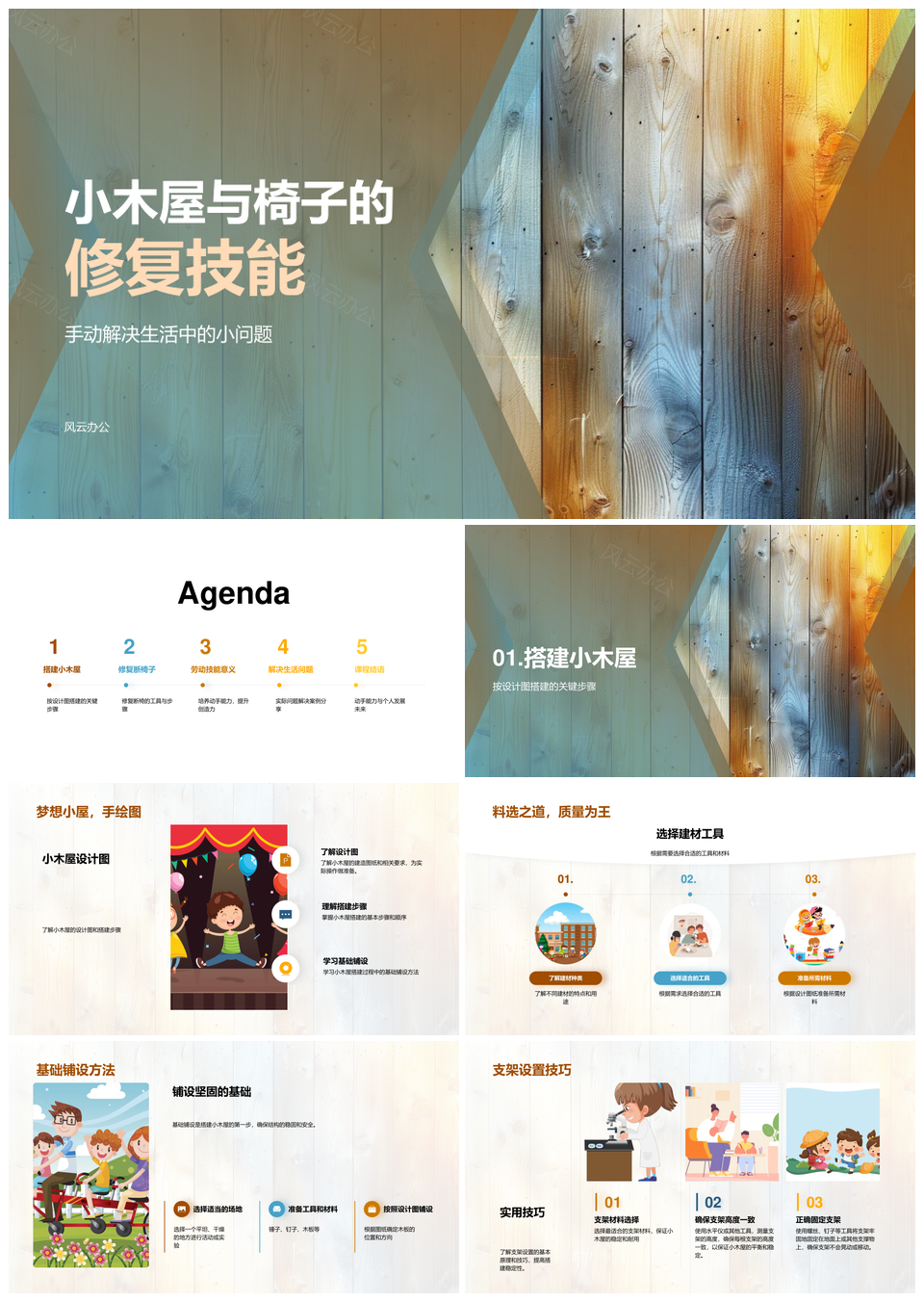这是一张小木屋椅子修复动手技能搭建工具解决生活问题PPT模板,包含小木屋、椅子、修复、动手技能、搭建、工具、生活问题等主题内容,也可用作动手技能搭建工具、搭建工具解决问题、小木屋椅子修复工具、修复椅子动手技能、小木屋修复工具、椅子修复工具、动手搭建工具、技能解决问题、解决生活问题、修复工具、搭建工具、动手技能、解决问题、生活问题、技能搭建工具等PPT场景使用。 风云办公提供的小木屋椅子修复动手技能搭建工具解决生活问题PPT模板,下载格式为pptx,一共29页,作品中文字及图均可以修改和编辑,图片更改请在作品中右键图片并更换,文字修改请直接点击文字进行修改。