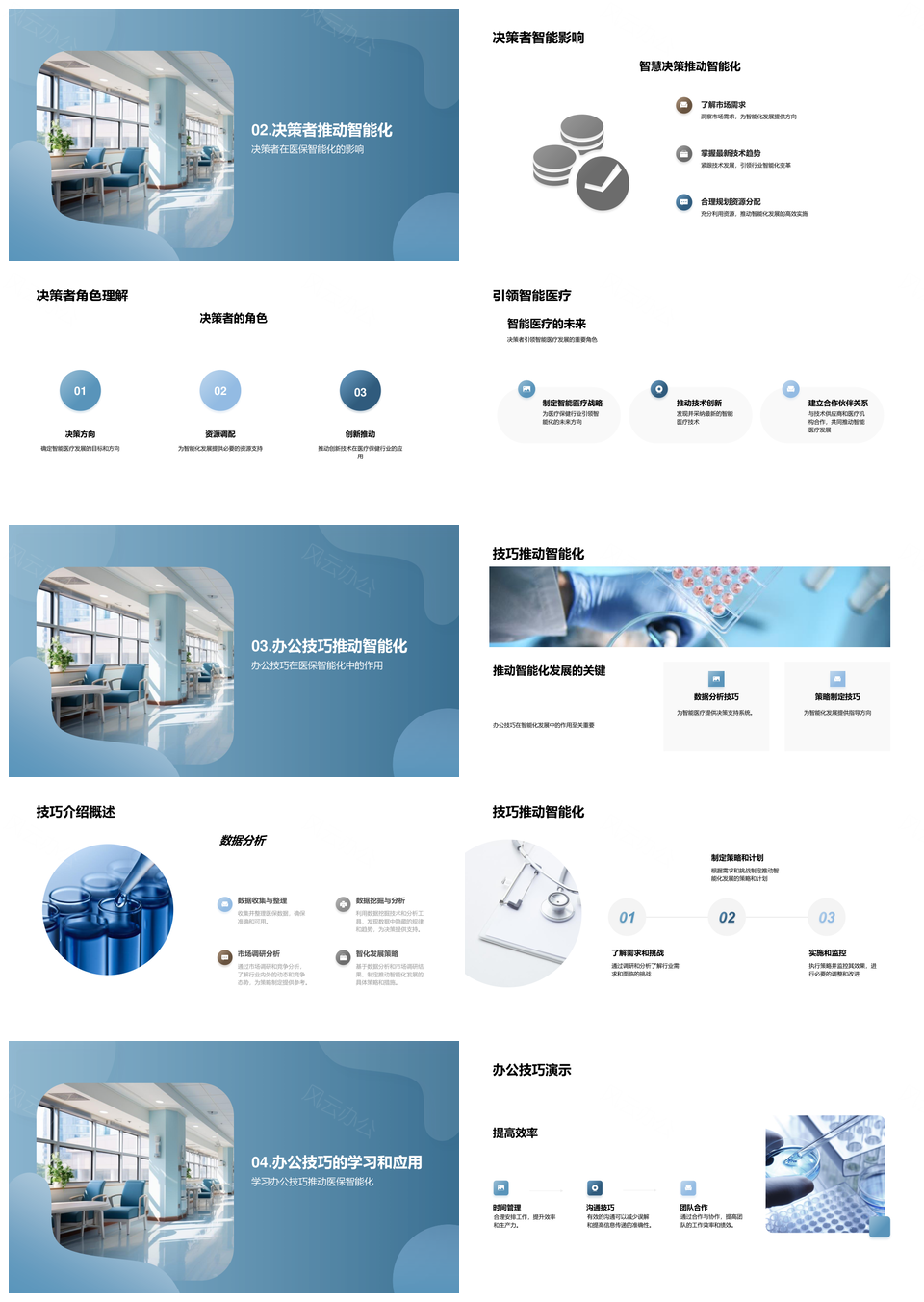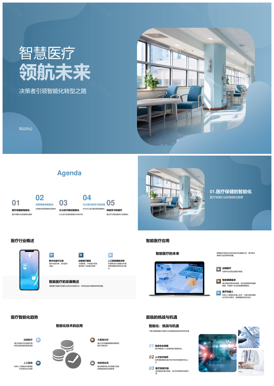 风云办公提供的智慧医疗决策者引领智能转型数据分析PPT模板,下载格式为pptx,一共24页,作品中文字及图均可以修改和编辑,图片更改请在作品中右键图片并更换,文字修改请直接点击文字进行修改。