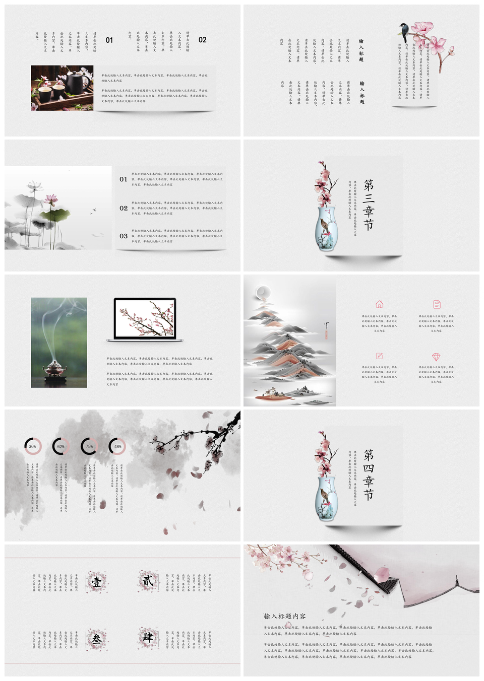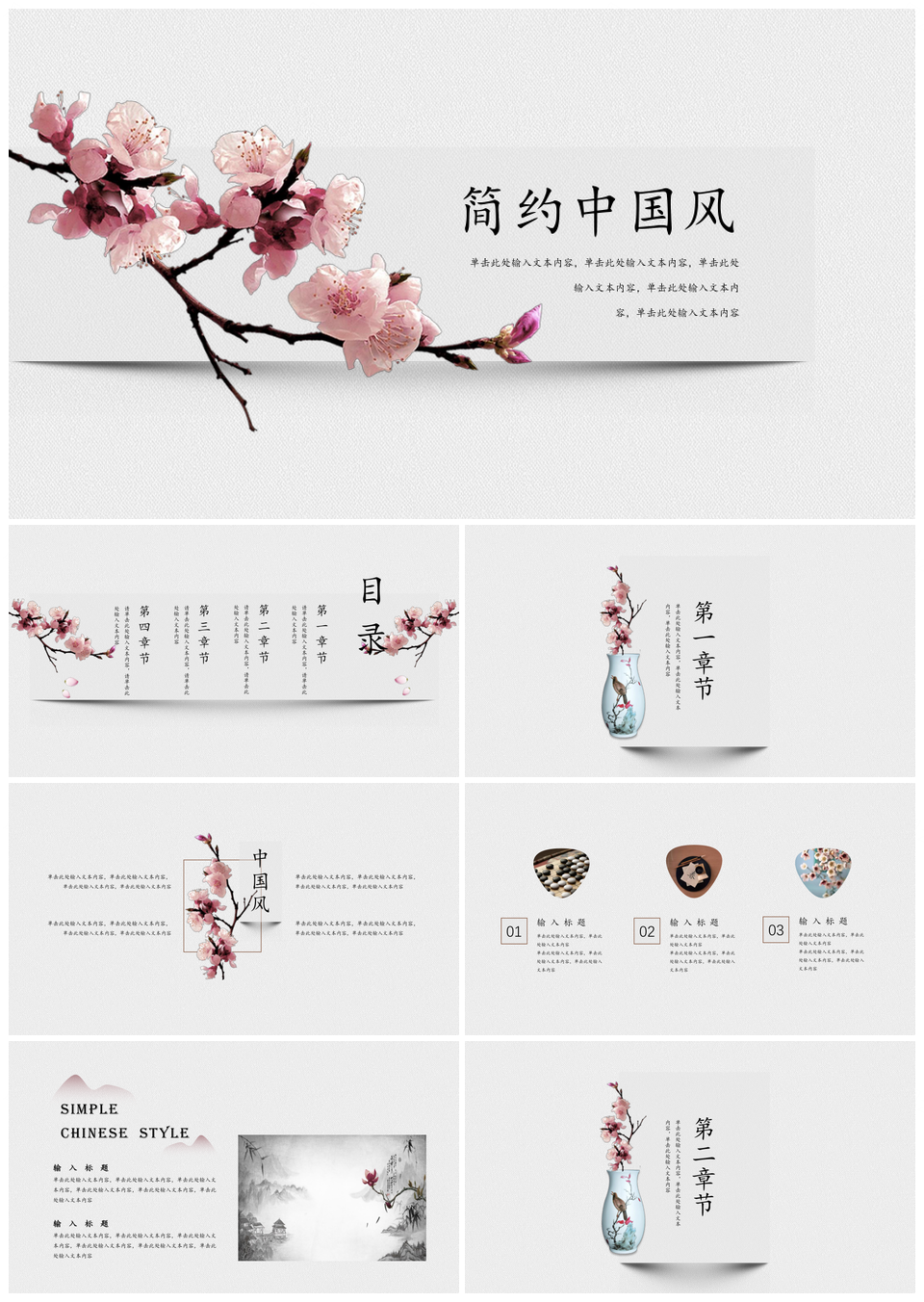 风云办公提供的白色简约桃花文艺中国风PPT模板,下载格式为pptx,一共18页,作品中文字及图均可以修改和编辑,图片更改请在作品中右键图片并更换,文字修改请直接点击文字进行修改。