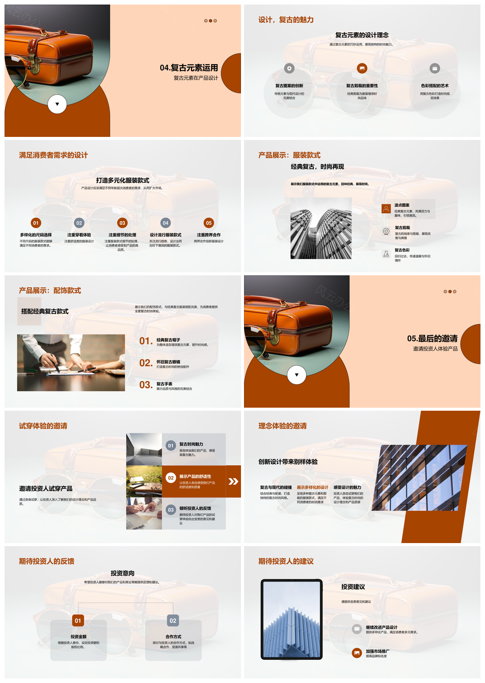 风云办公提供的复古时尚市场策略与手提箱设计分析PPT模板,下载格式为pptx,一共28页,作品中文字及图均可以修改和编辑,图片更改请在作品中右键图片并更换,文字修改请直接点击文字进行修改。