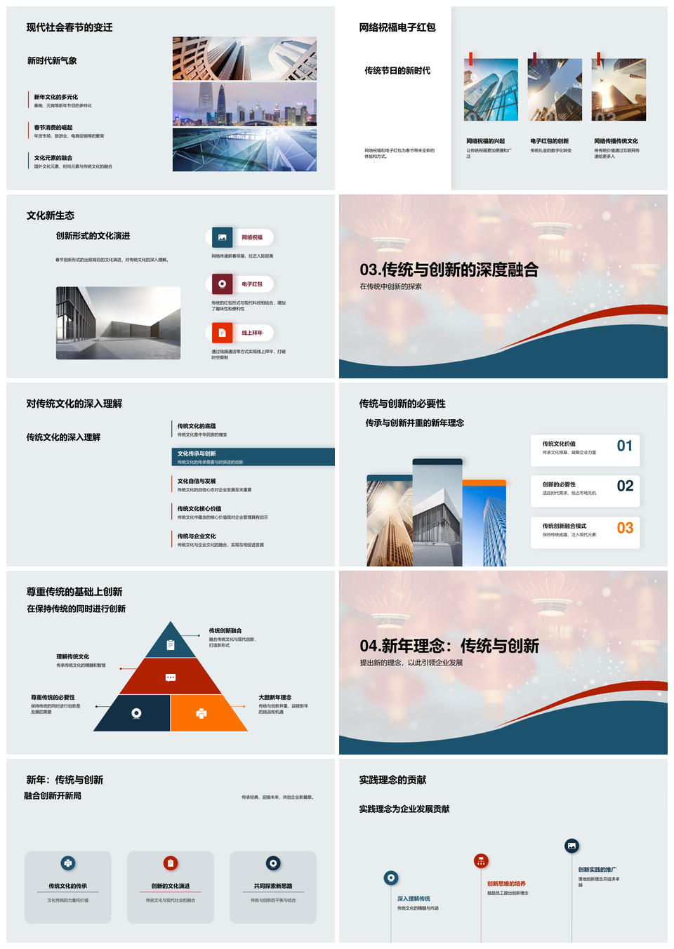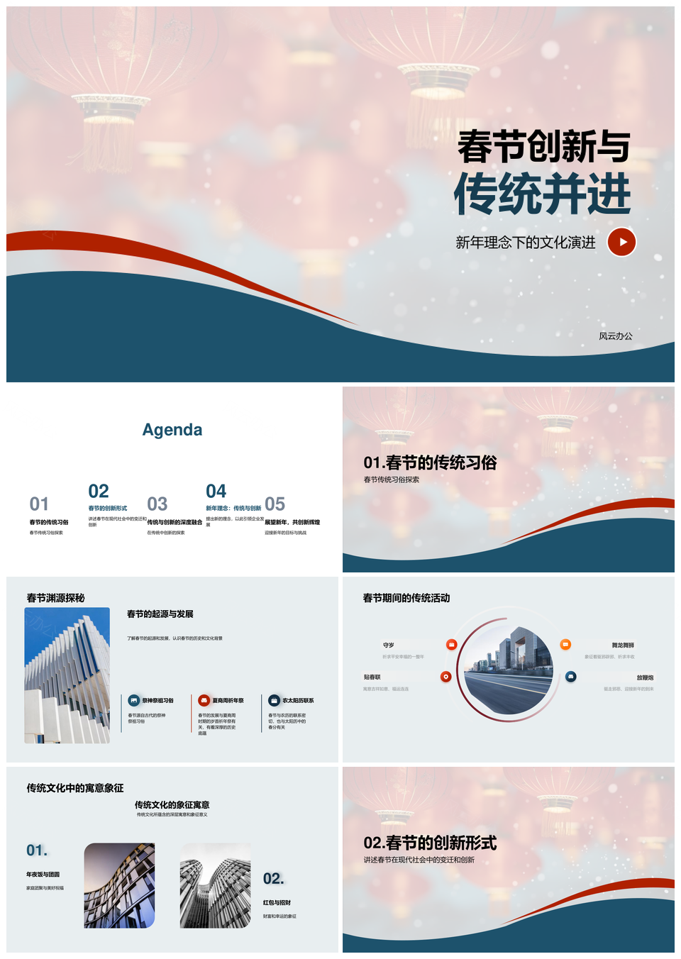 风云办公提供的春节传承创新演进灯笼映古今PPT模板,下载格式为pptx,一共23页,作品中文字及图均可以修改和编辑,图片更改请在作品中右键图片并更换,文字修改请直接点击文字进行修改。