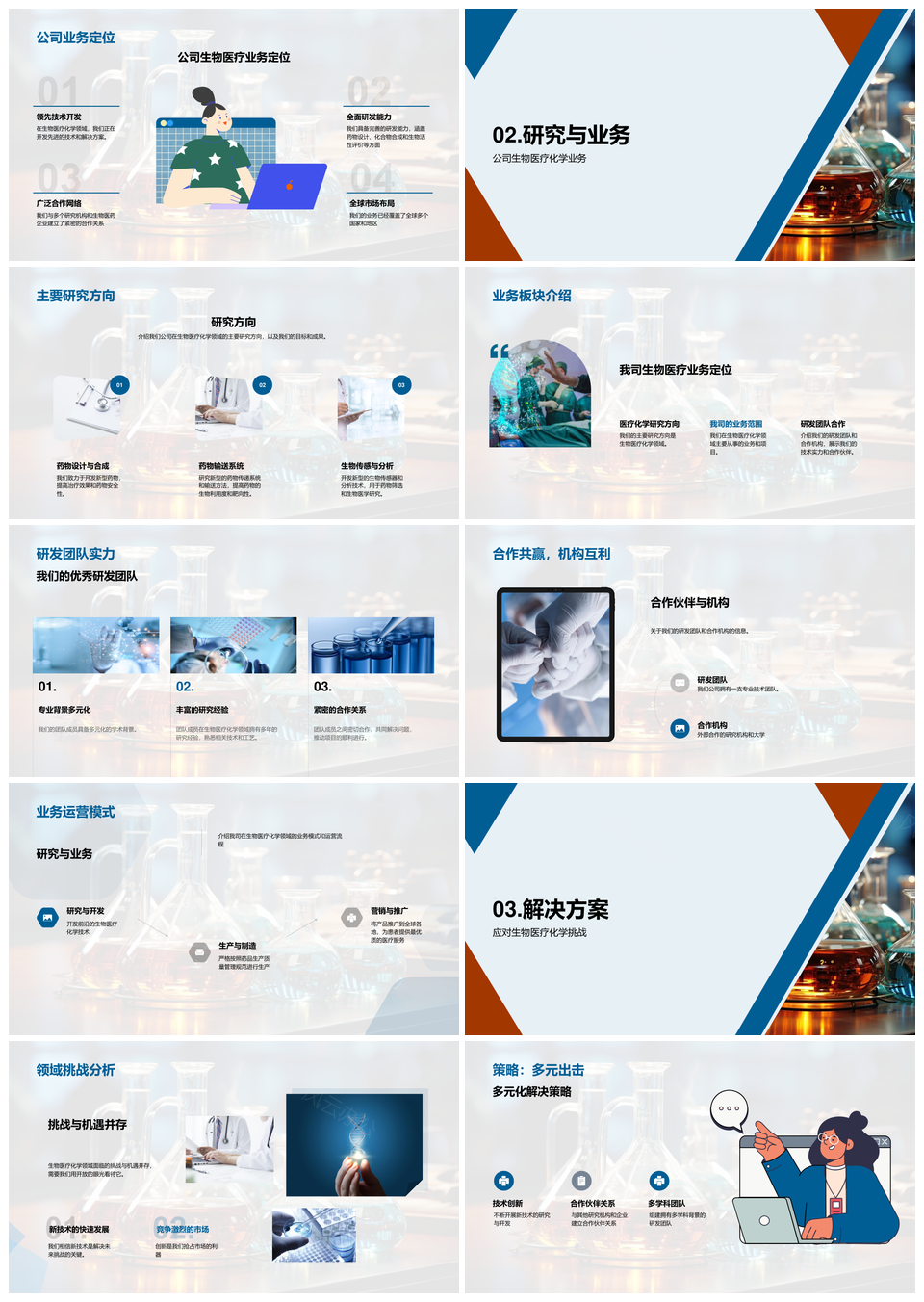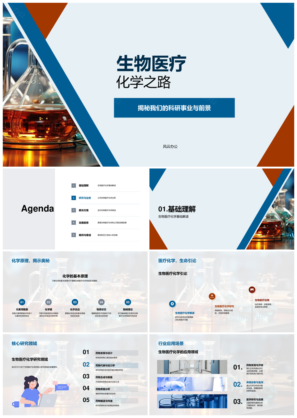 风云办公提供的生物医疗化学研发团队合作业务定位PPT模板,下载格式为pptx,一共33页,作品中文字及图均可以修改和编辑,图片更改请在作品中右键图片并更换,文字修改请直接点击文字进行修改。