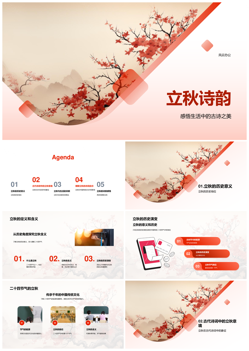 风云办公提供的立秋古诗词节气史话诗意生活PPT模板,下载格式为pptx,一共23页,作品中文字及图均可以修改和编辑,图片更改请在作品中右键图片并更换,文字修改请直接点击文字进行修改。