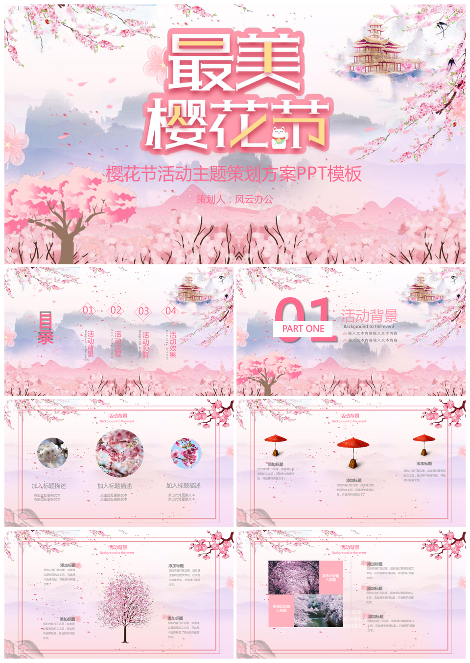 风云办公提供的樱花节活动主题策划方案PPT模板,下载格式为pptx,一共20页,作品中文字及图均可以修改和编辑,图片更改请在作品中右键图片并更换,文字修改请直接点击文字进行修改。