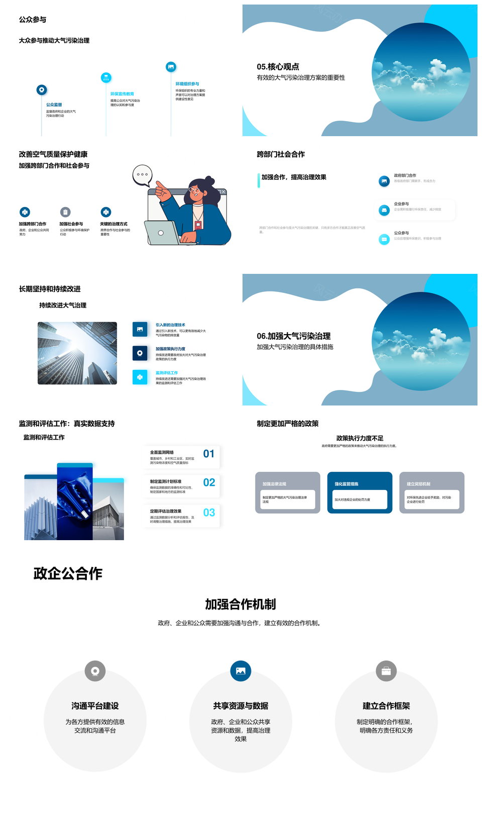 这是一张环保专家政府共商大气污染治理挑战护蓝天PPT模板,包含环保专家、政府、共商、大气污染治理、挑战、蓝天等主题内容,也可用作环保专家政府共商、专家政府共商大气、政府共商大气污染、共商大气污染治理、大气污染治理挑战、环保专家政府、专家政府共商、政府共商大气、共商大气污染、大气污染治理、污染治理挑战、治理挑战蓝天、环保专家、专家政府、政府共商等PPT场景使用。 风云办公提供的环保专家政府共商大气污染治理挑战护蓝天PPT模板,下载格式为pptx,一共27页,作品中文字及图均可以修改和编辑,图片更改请在作品中右键图片并更换,文字修改请直接点击文字进行修改。