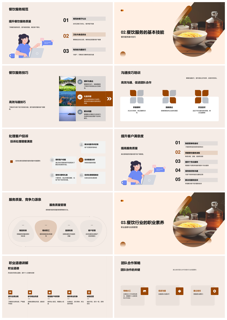 风云办公提供的餐饮新手全方位指南一套餐具掌握PPT模板,下载格式为pptx,一共33页,作品中文字及图均可以修改和编辑,图片更改请在作品中右键图片并更换,文字修改请直接点击文字进行修改。