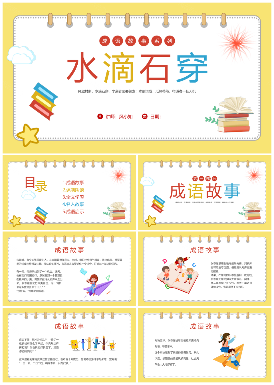 风云办公提供的黄色多彩卡通成语水滴石穿班会课件,下载格式为pptx,一共25页,作品中文字及图均可以修改和编辑,图片更改请在作品中右键图片并更换,文字修改请直接点击文字进行修改。