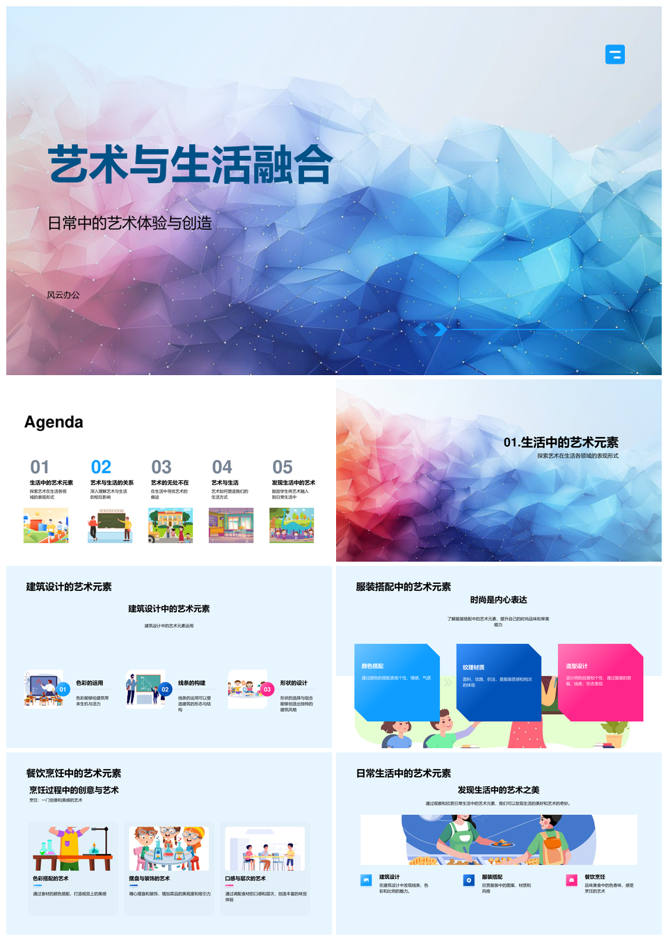 风云办公提供的艺术生活交融建筑服饰餐饮设计PPT模板,下载格式为pptx,一共24页,作品中文字及图均可以修改和编辑,图片更改请在作品中右键图片并更换,文字修改请直接点击文字进行修改。