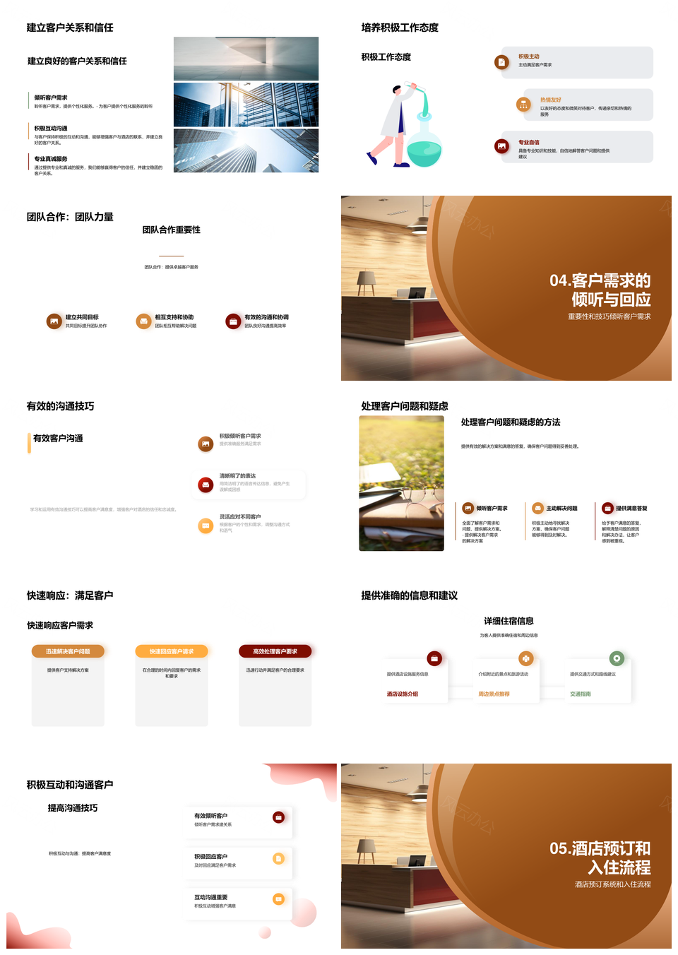 风云办公提供的酒店前台员工接待解答投诉处理培训PPT模板,下载格式为pptx,一共33页,作品中文字及图均可以修改和编辑,图片更改请在作品中右键图片并更换,文字修改请直接点击文字进行修改。