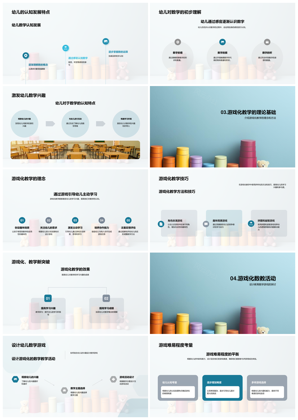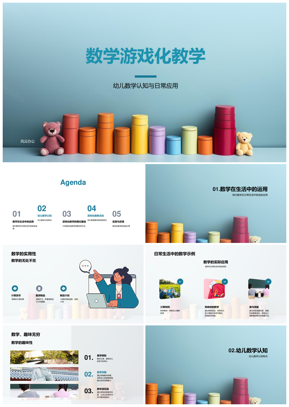 风云办公提供的幼儿数学游戏化教学实用趣味日常应用PPT模板,下载格式为pptx,一共23页,作品中文字及图均可以修改和编辑,图片更改请在作品中右键图片并更换,文字修改请直接点击文字进行修改。