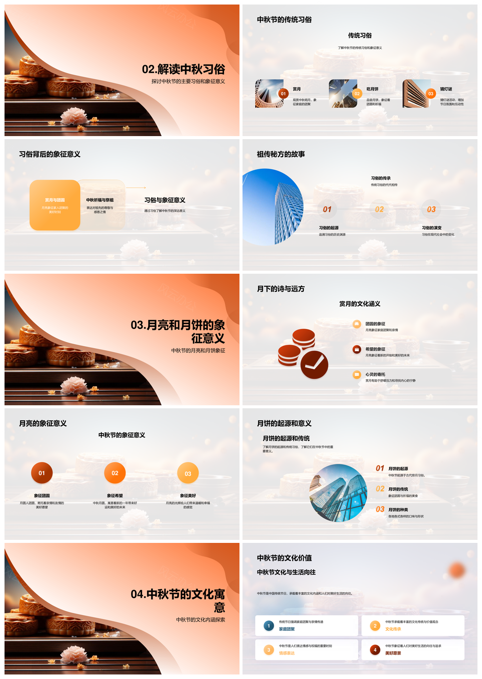 这是一张中秋团圆月饼月亮象征起源习俗传承PPT模板,包含中秋、团圆、月饼、月亮、象征、起源、习俗、传承等主题内容,也可用作中秋团圆习俗传承、中秋团圆月饼月亮、月饼象征起源习俗、月亮象征起源习俗、中秋习俗起源传承、月饼月亮习俗传承、中秋月饼团圆象征、象征起源习俗传承、团圆月饼象征月亮、中秋月亮起源习俗、中秋月饼习俗传承、团圆月亮起源习俗、中秋团圆月饼象征、习俗传承起源象征、团圆月饼习俗起源等PPT场景使用。