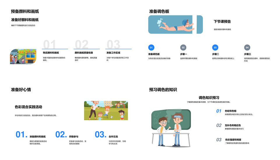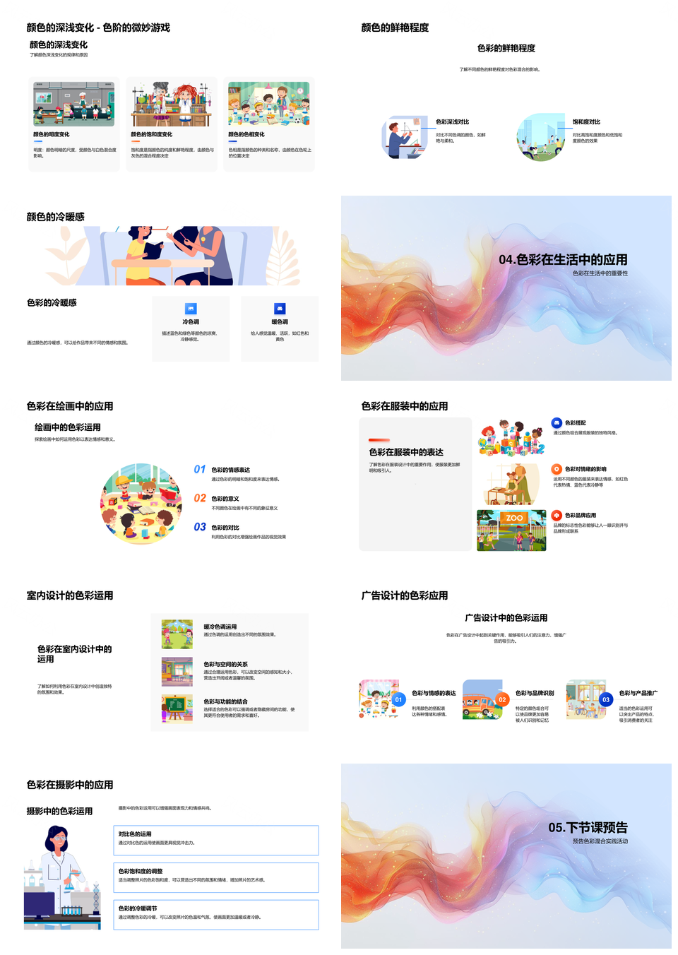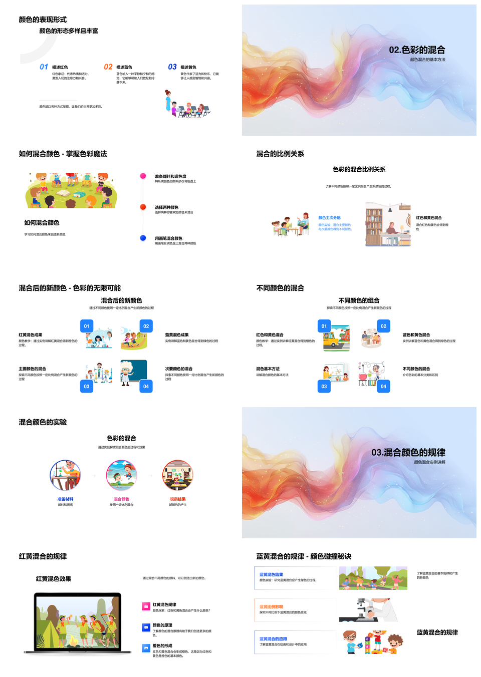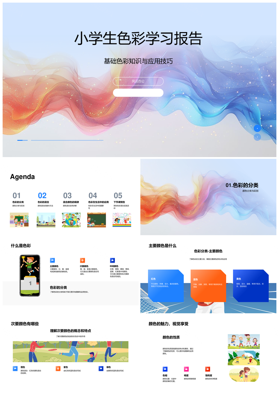 风云办公提供的小学生色彩基础与颜色混合应用学习PPT模板,下载格式为pptx,一共32页,作品中文字及图均可以修改和编辑,图片更改请在作品中右键图片并更换,文字修改请直接点击文字进行修改。