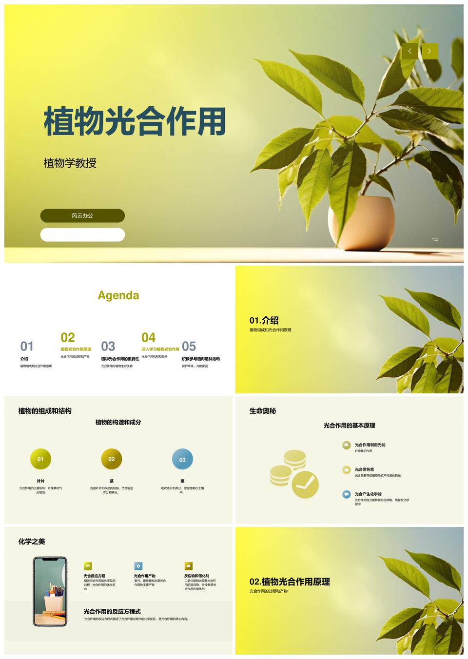 风云办公提供的植物光合作用光能吸收碳固定反应产物PPT模板,下载格式为pptx,一共22页,作品中文字及图均可以修改和编辑,图片更改请在作品中右键图片并更换,文字修改请直接点击文字进行修改。