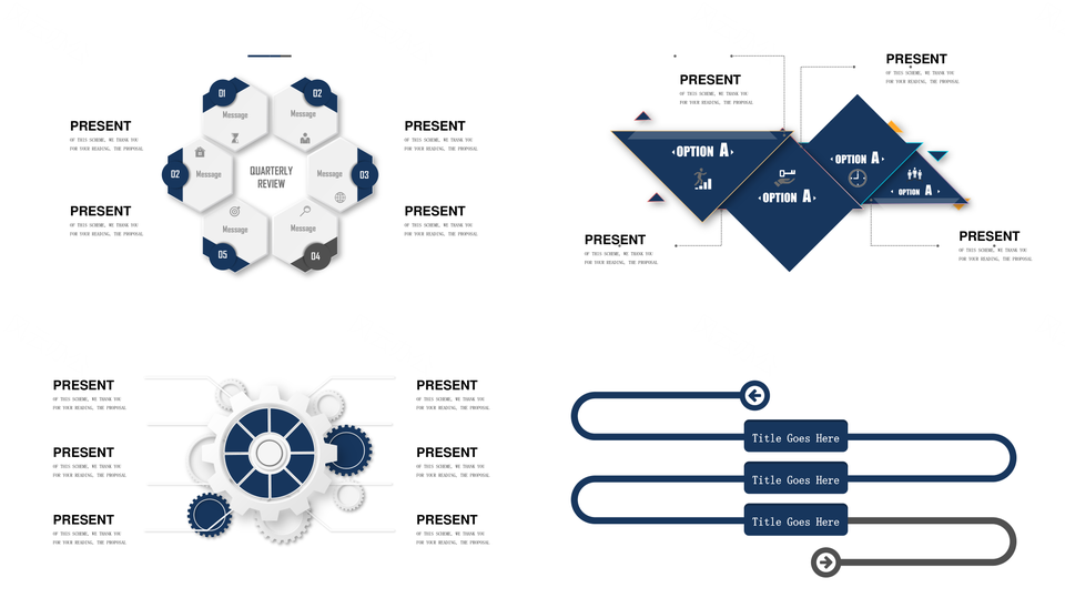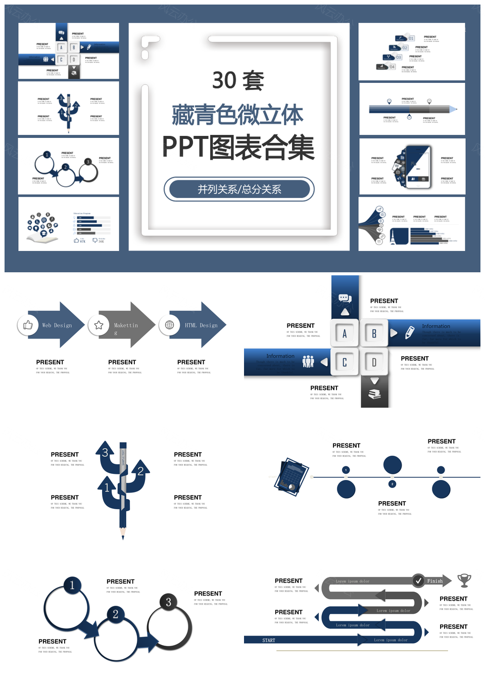 风云办公提供的藏青色微立体并列关系总分关系PPT图表合集,下载格式为pptx,一共31页,作品中文字及图均可以修改和编辑,图片更改请在作品中右键图片并更换,文字修改请直接点击文字进行修改。