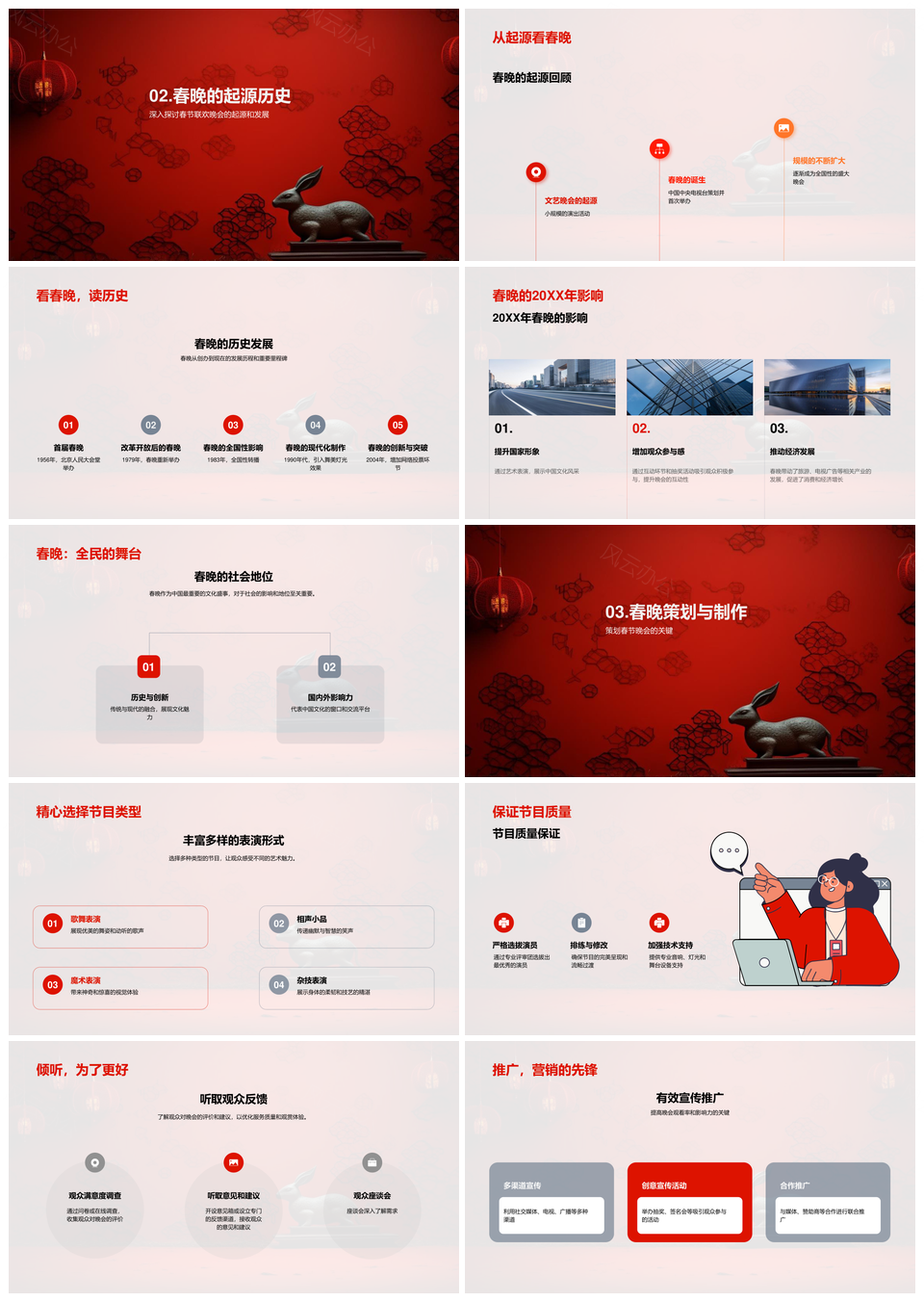 这是一张春晚策划传统创新节目品质观众反馈宣传中国灯笼PPT模板,包含春晚、策划、传统、创新、节目、品质、观众、反馈、宣传、中国灯笼等主题内容,也可用作春晚策划传统创新、观众反馈宣传中国、传统创新节目、策划传统创新、春晚策划创新、观众反馈宣传、反馈宣传中国、宣传中国灯笼、节目品质、观众反馈、宣传中国、中国灯笼、春晚策划、传统创新、创新节目等PPT场景使用。 风云办公提供的春晚策划传统创新节目品质观众反馈宣传中国灯笼PPT模板,下载格式为pptx,一共27页,作品中文字及图均可以修改和编辑,图片更改请在作品中右键图片并更换,文字修改请直接点击文字进行修改。