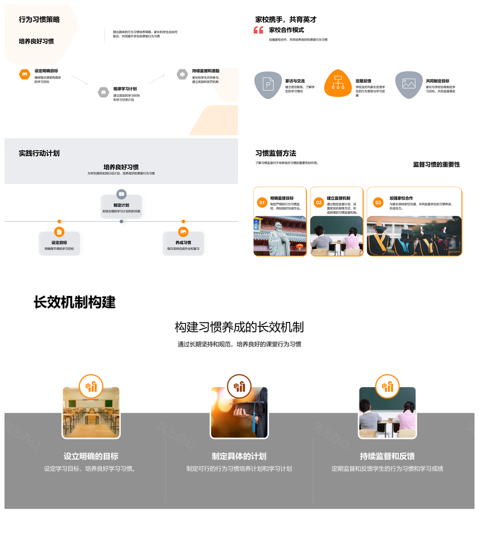 风云办公提供的家校课堂习惯提升学业成绩家长开放日PPT模板,下载格式为pptx,一共33页,作品中文字及图均可以修改和编辑,图片更改请在作品中右键图片并更换,文字修改请直接点击文字进行修改。