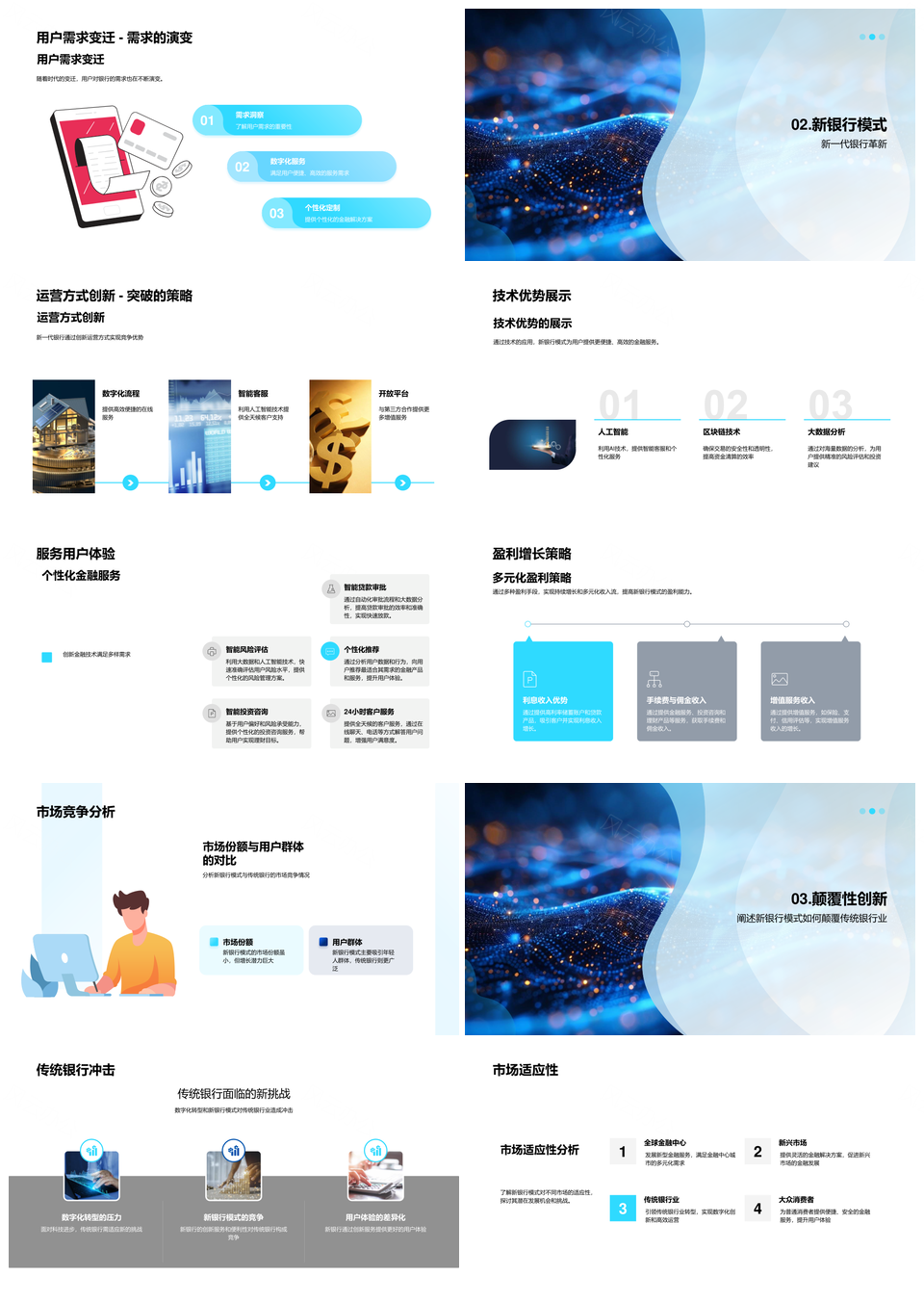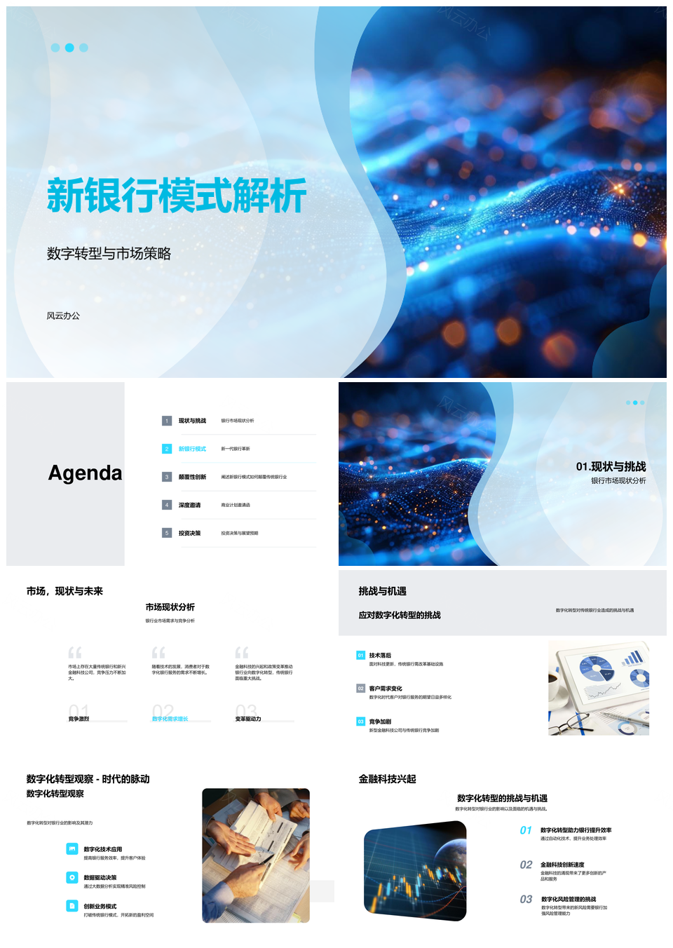 风云办公提供的新银行数字转型金融科技颠覆创新策略PPT模板,下载格式为pptx,一共33页,作品中文字及图均可以修改和编辑,图片更改请在作品中右键图片并更换,文字修改请直接点击文字进行修改。